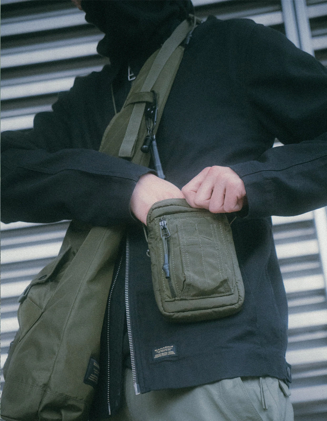 MA-1 sleeve pocket inspired bag with Snocord® strap, zip closure and front accessory pockets.