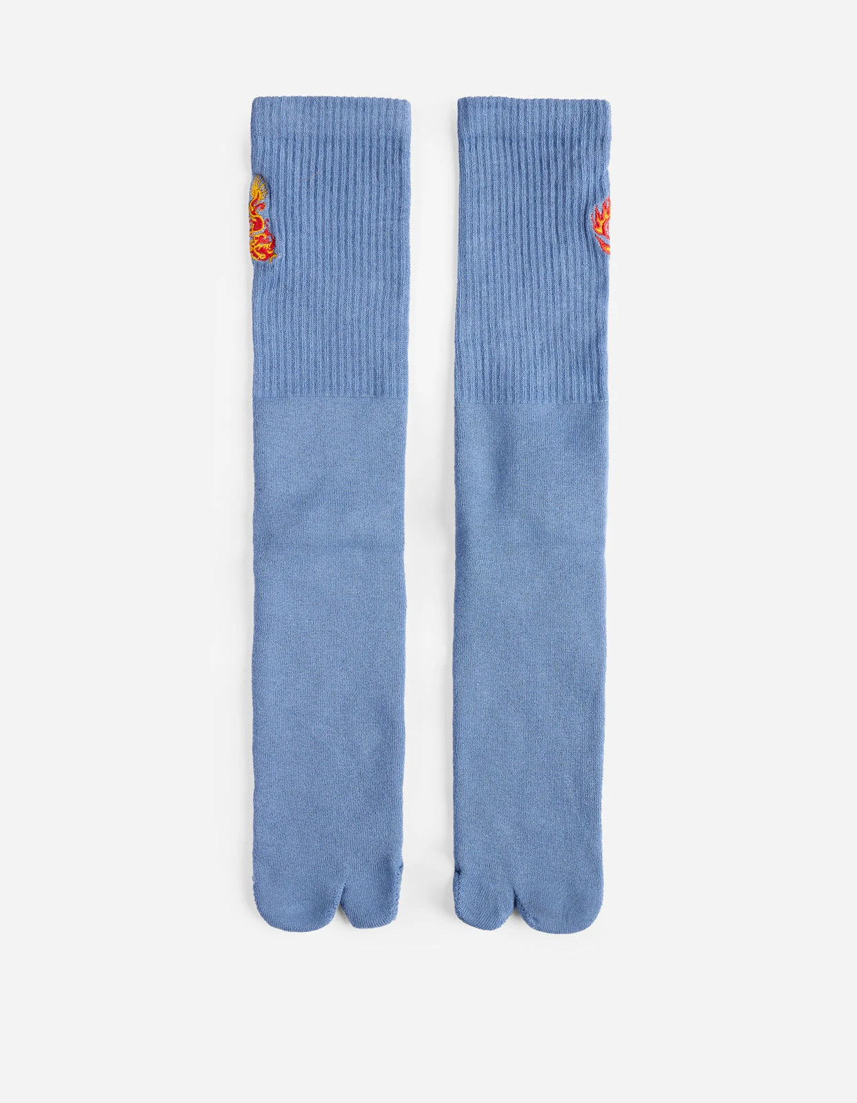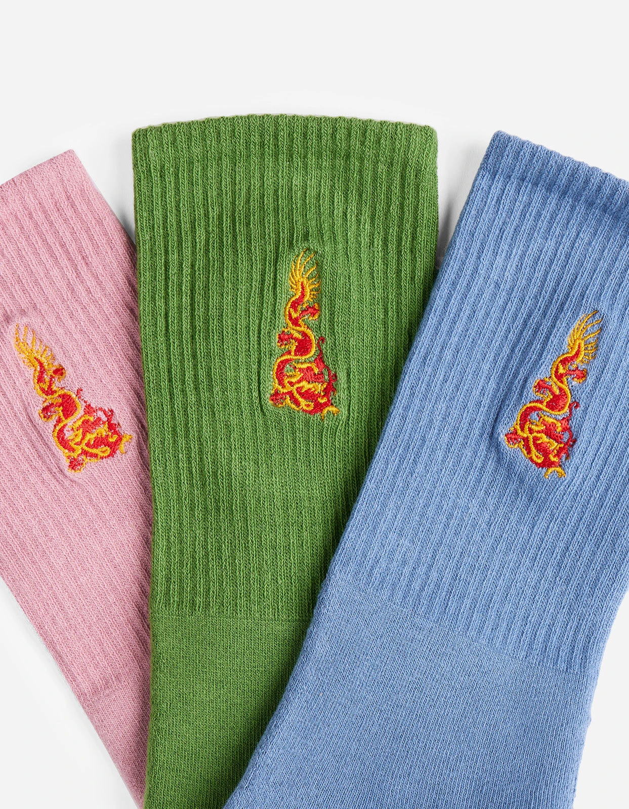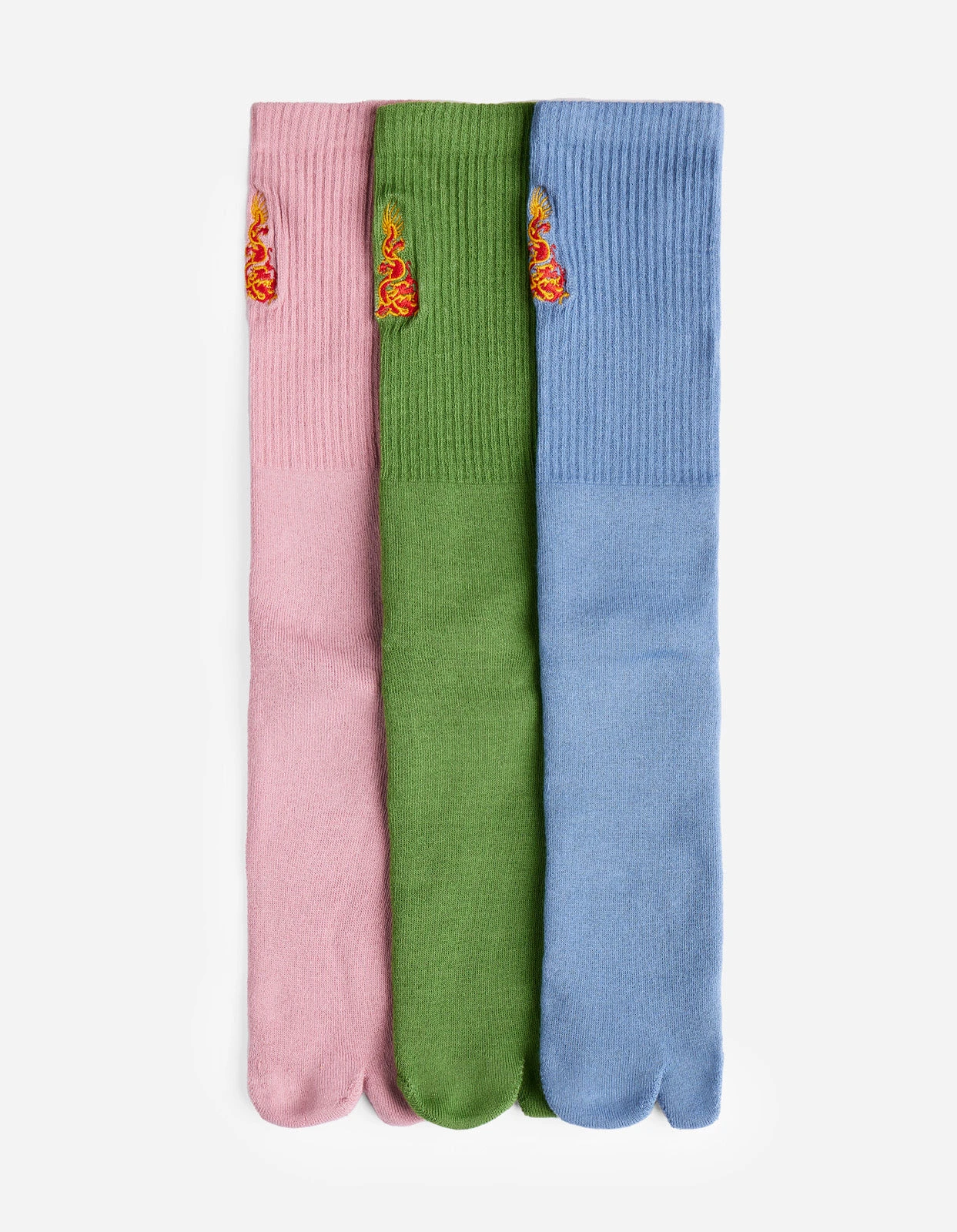 Three pairs of Japanese inspired split toe socks in blue, green and pink, embroidered with a micro dragon motif.