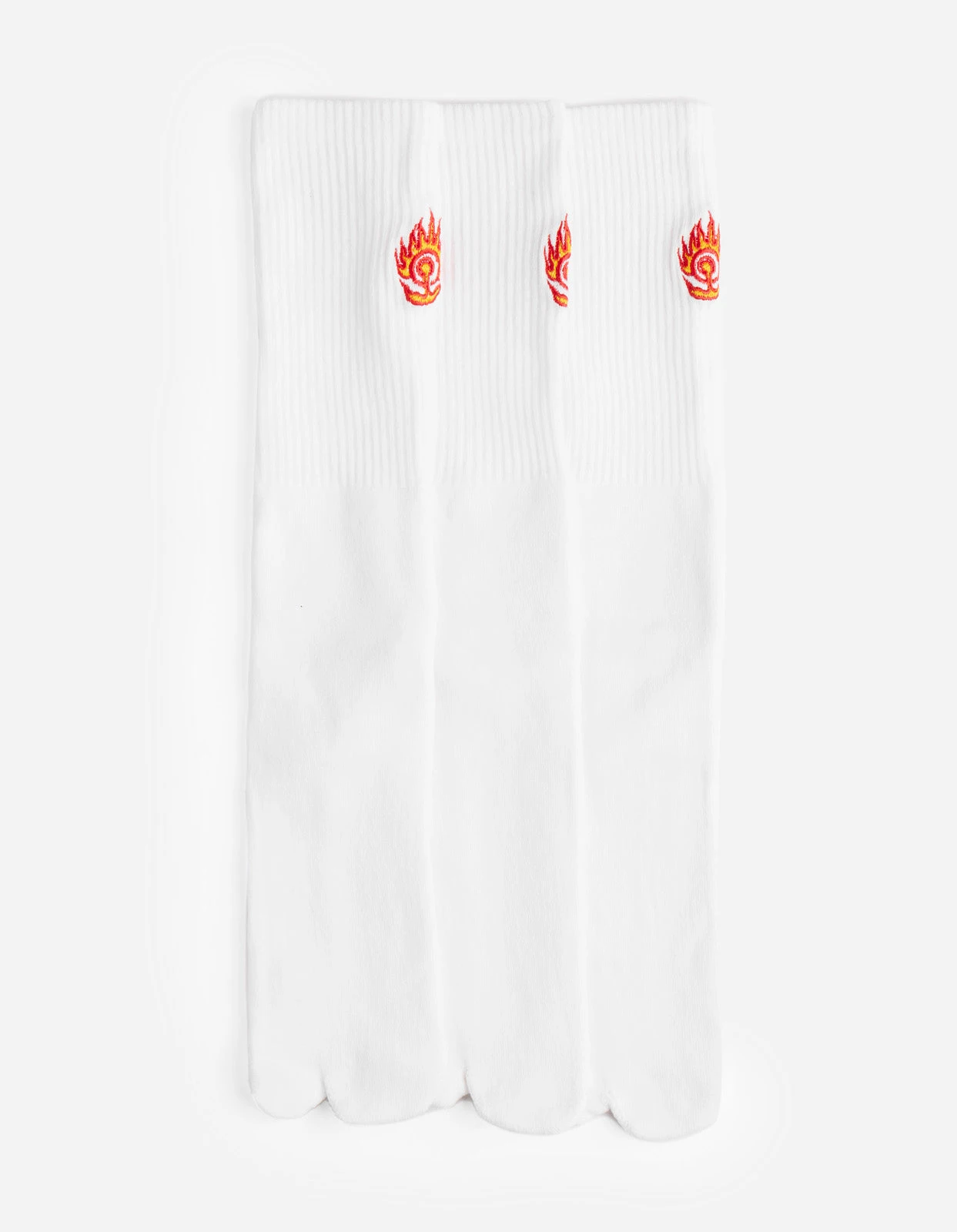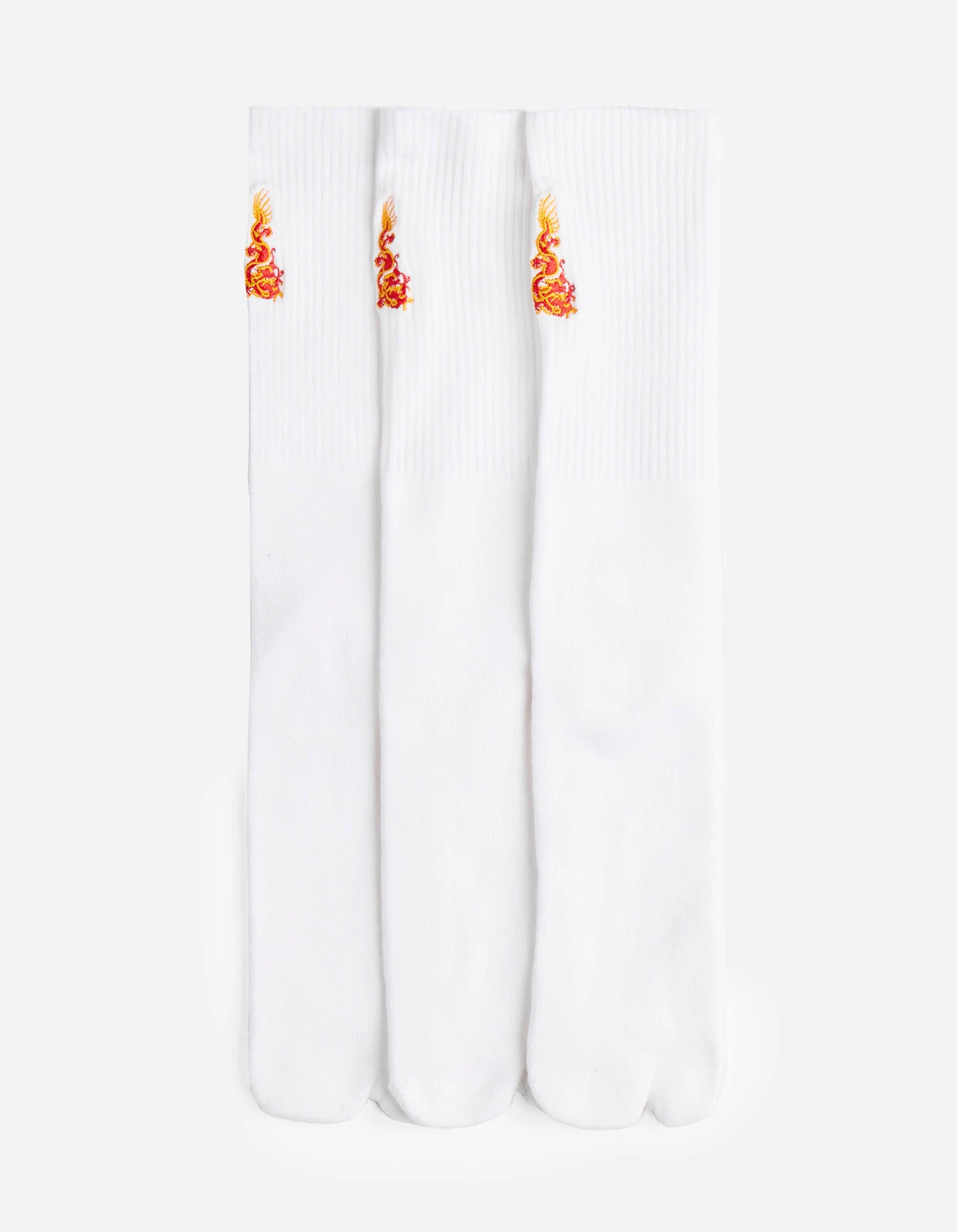 Three pairs of white Japanese inspired split toe socks in blue, embroidered with a micro dragon motif.