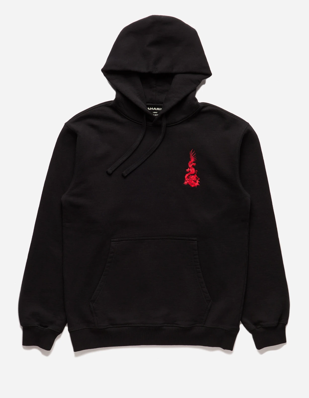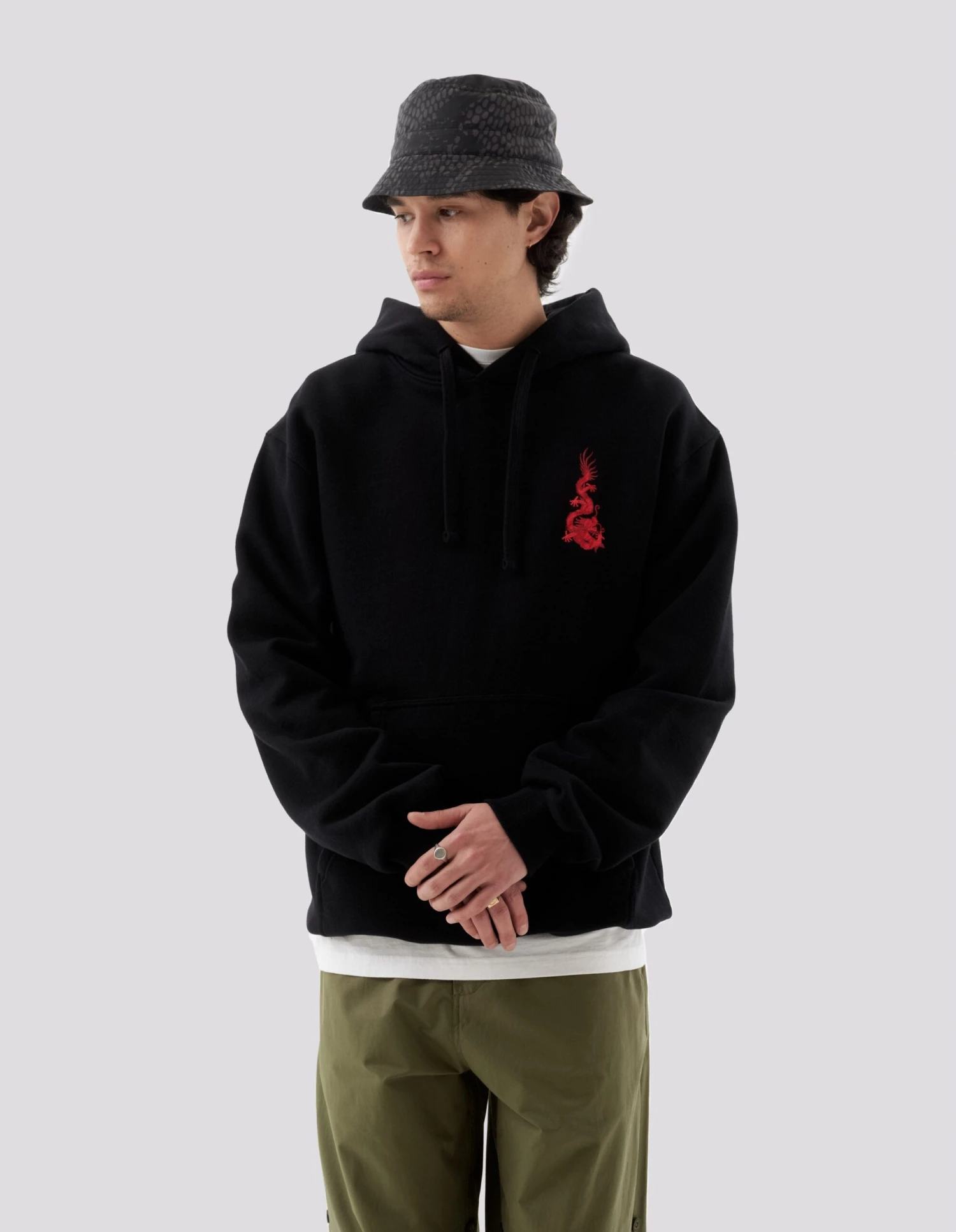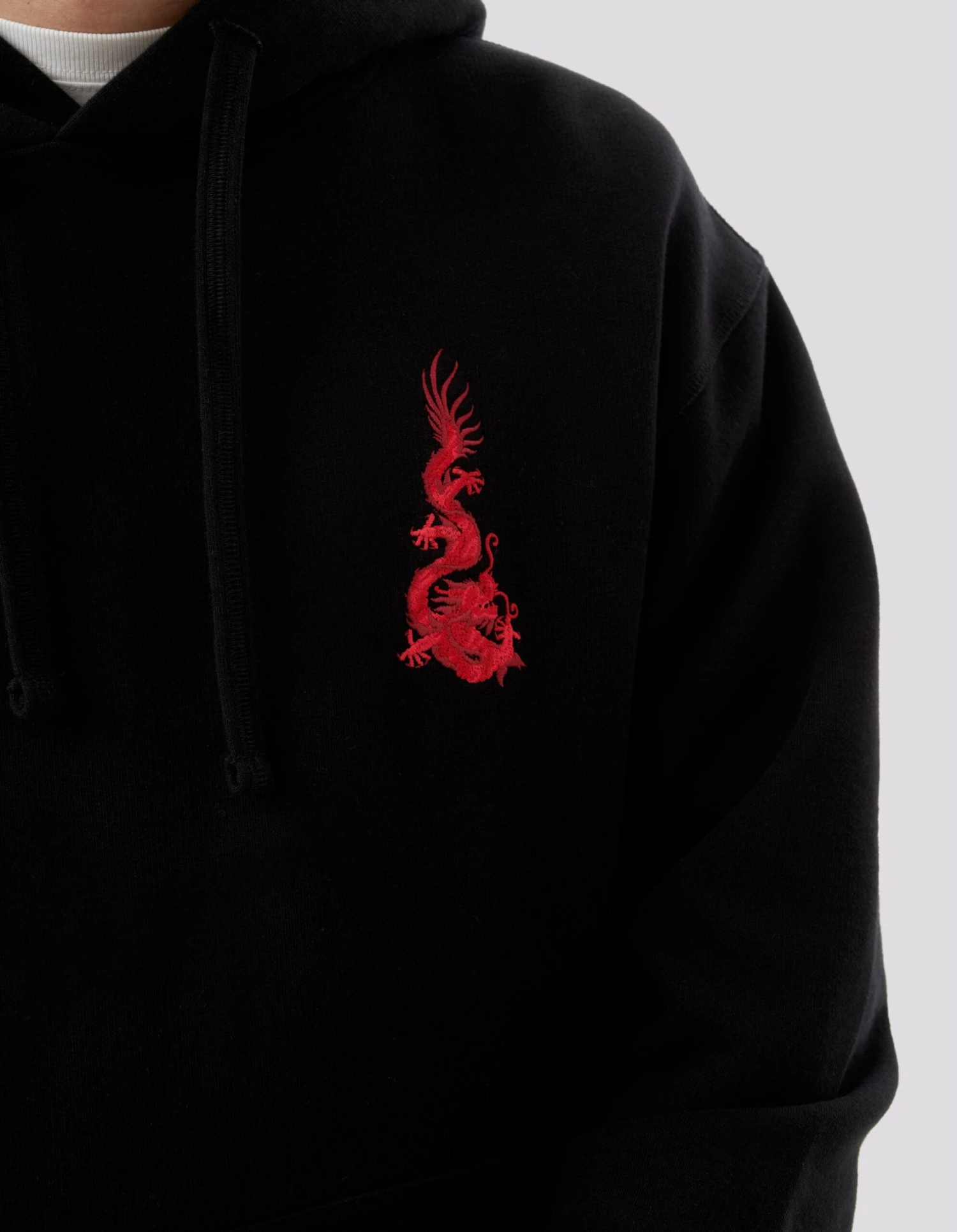 Pullover hoody in 450gsm organic cotton featuring a hand-machine embroidered Original Dragon motif at the chest.