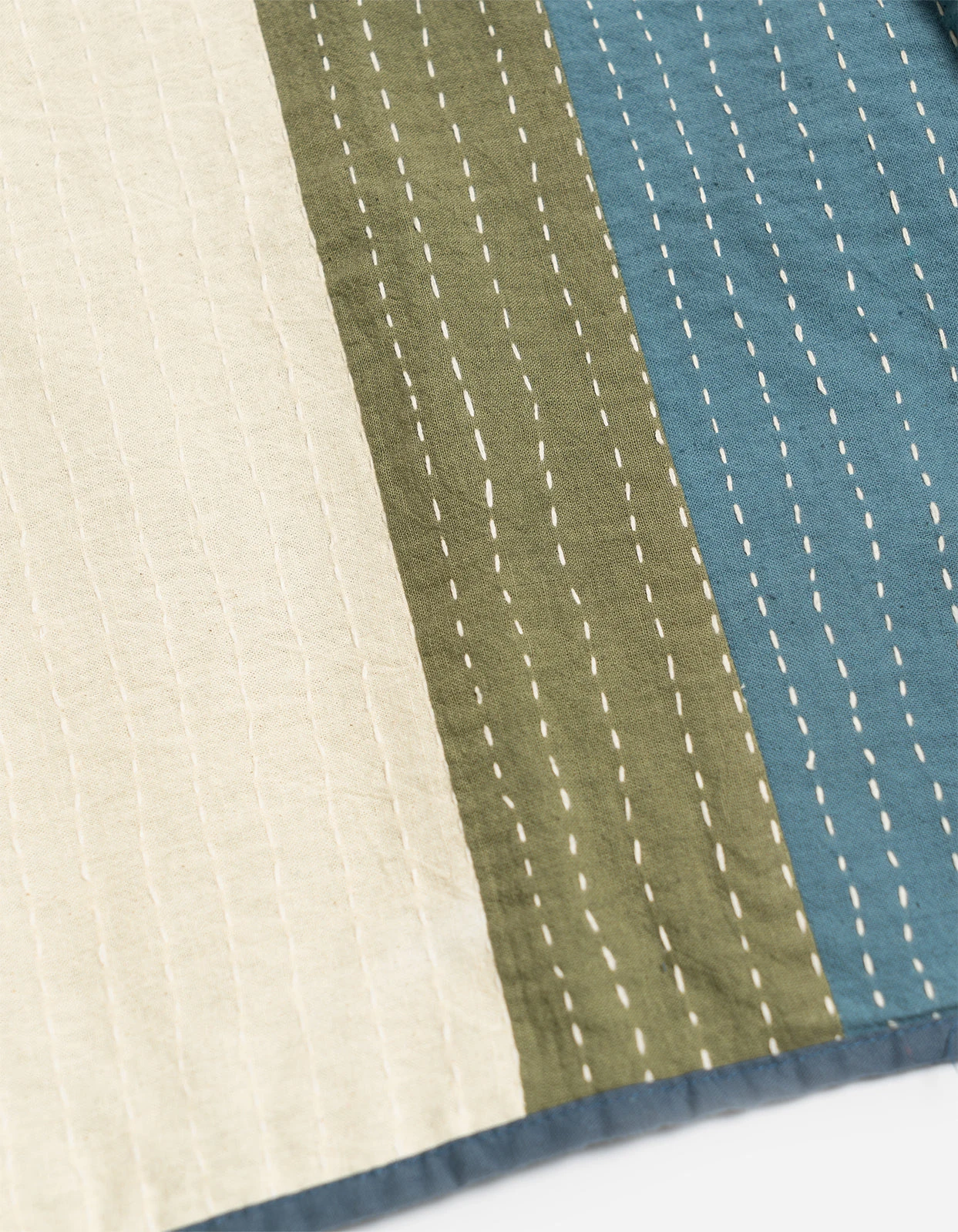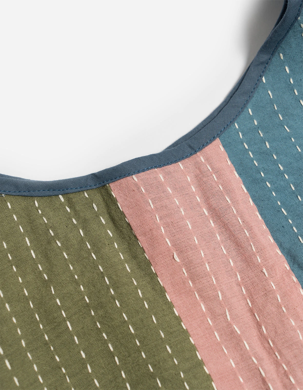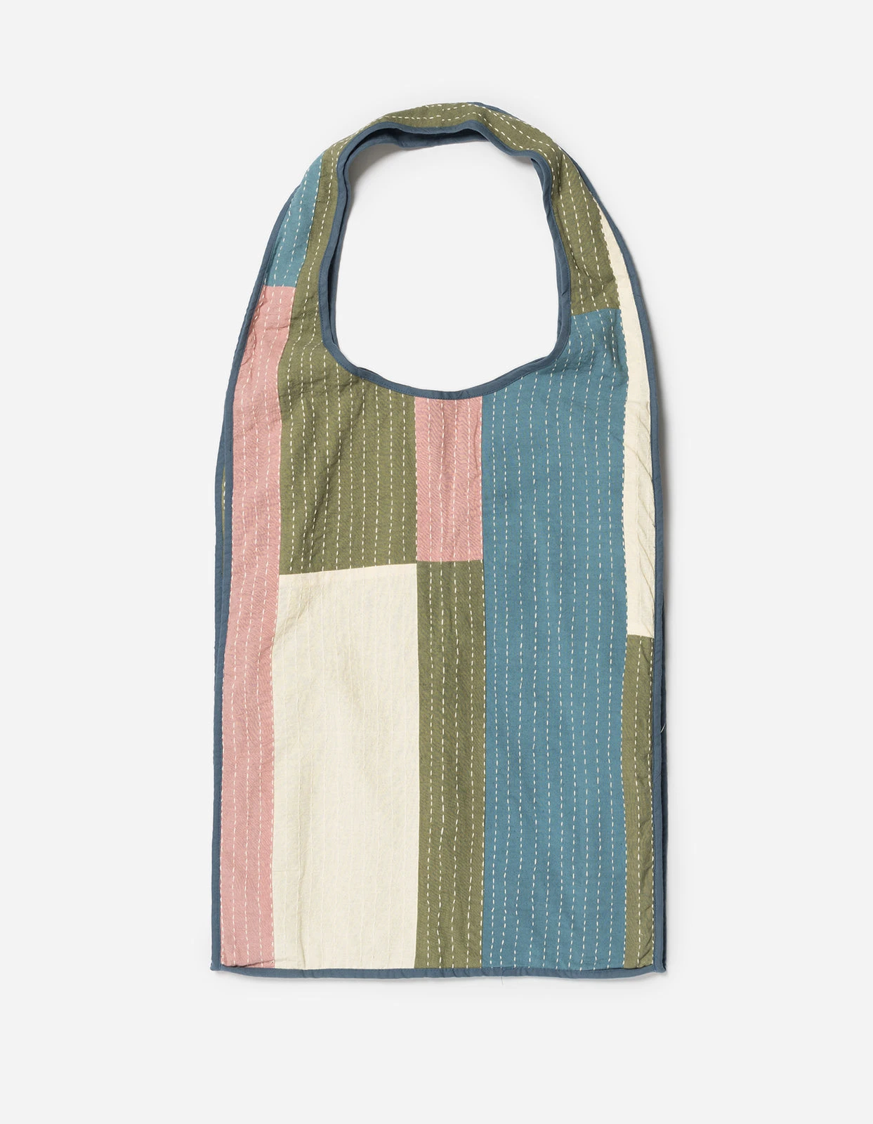 Patchwork sling tote bag in a woven kantha quilting with pocket gusset.