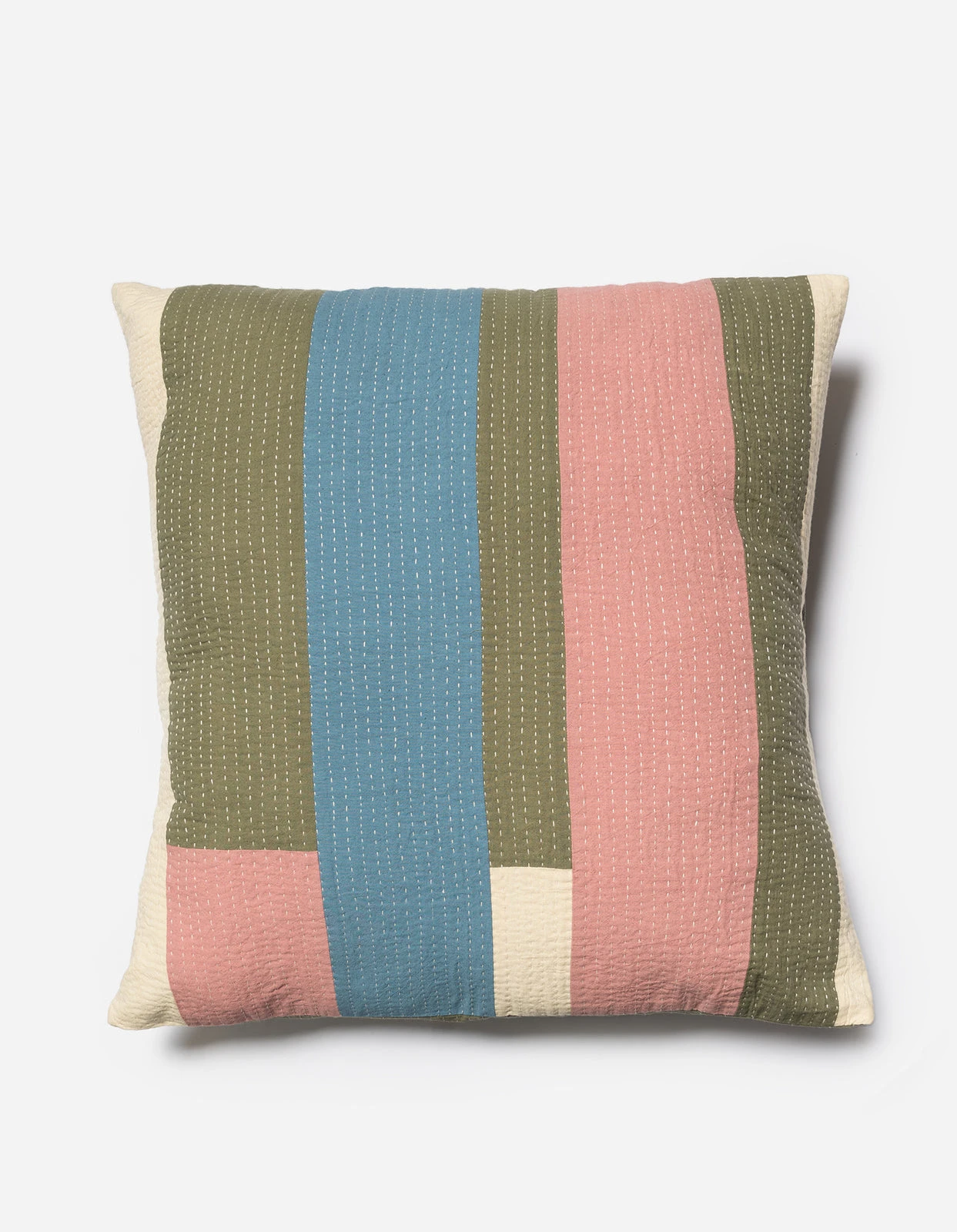 Large Kantha quilted cushion constructed from a pastel-toned patchwork.