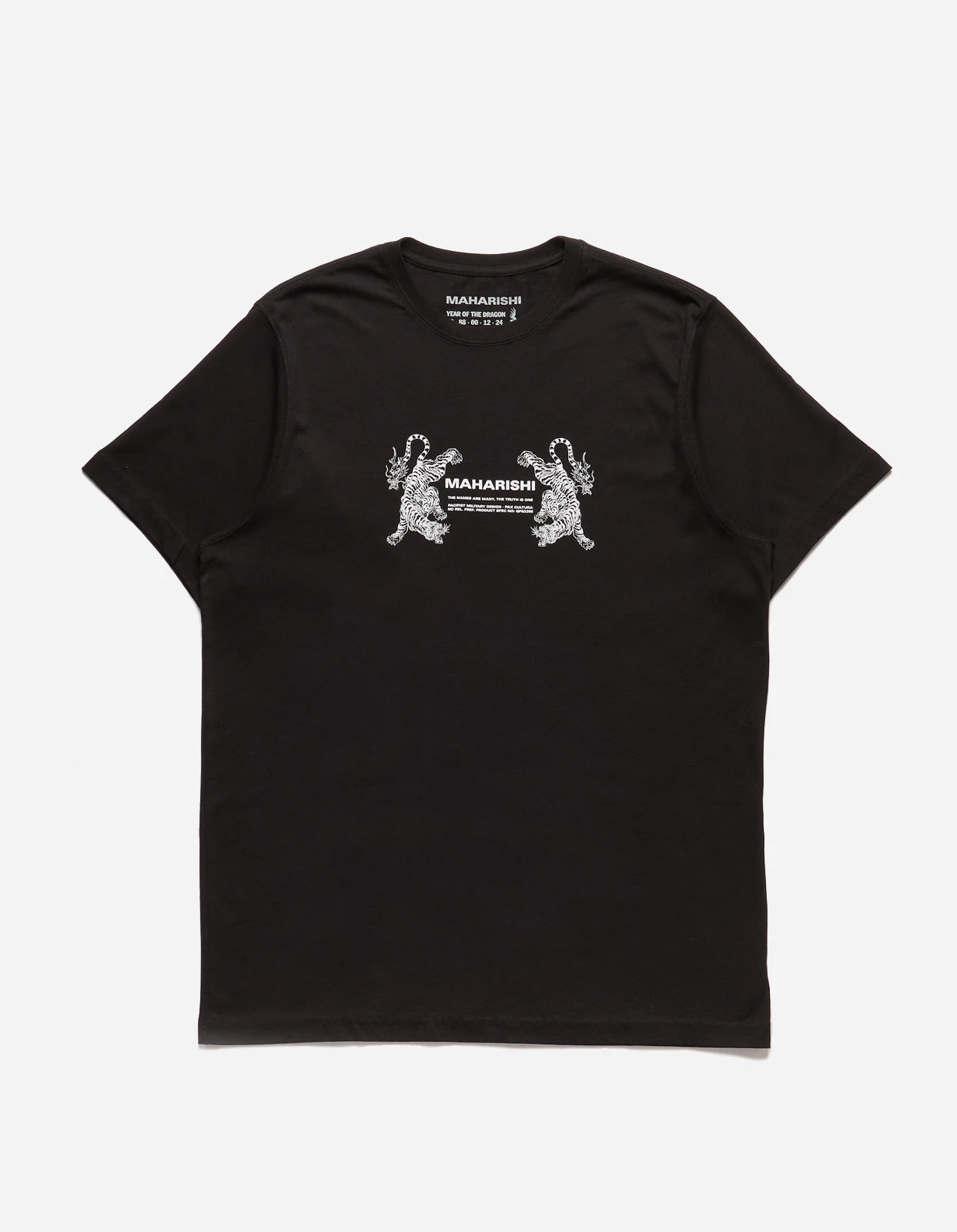 Black short sleeve tee with a Maharishi MILTYPE double tigers print at the chest, crafted from organic cotton in a relaxed fit.