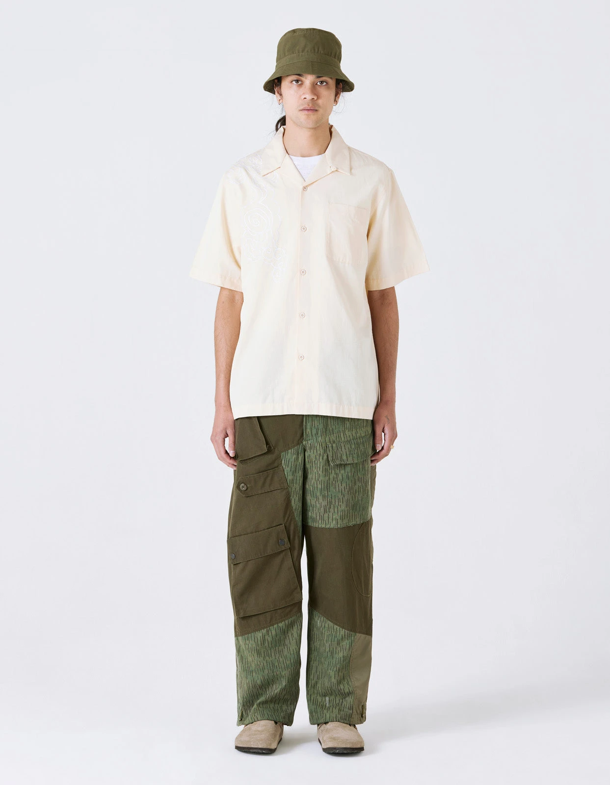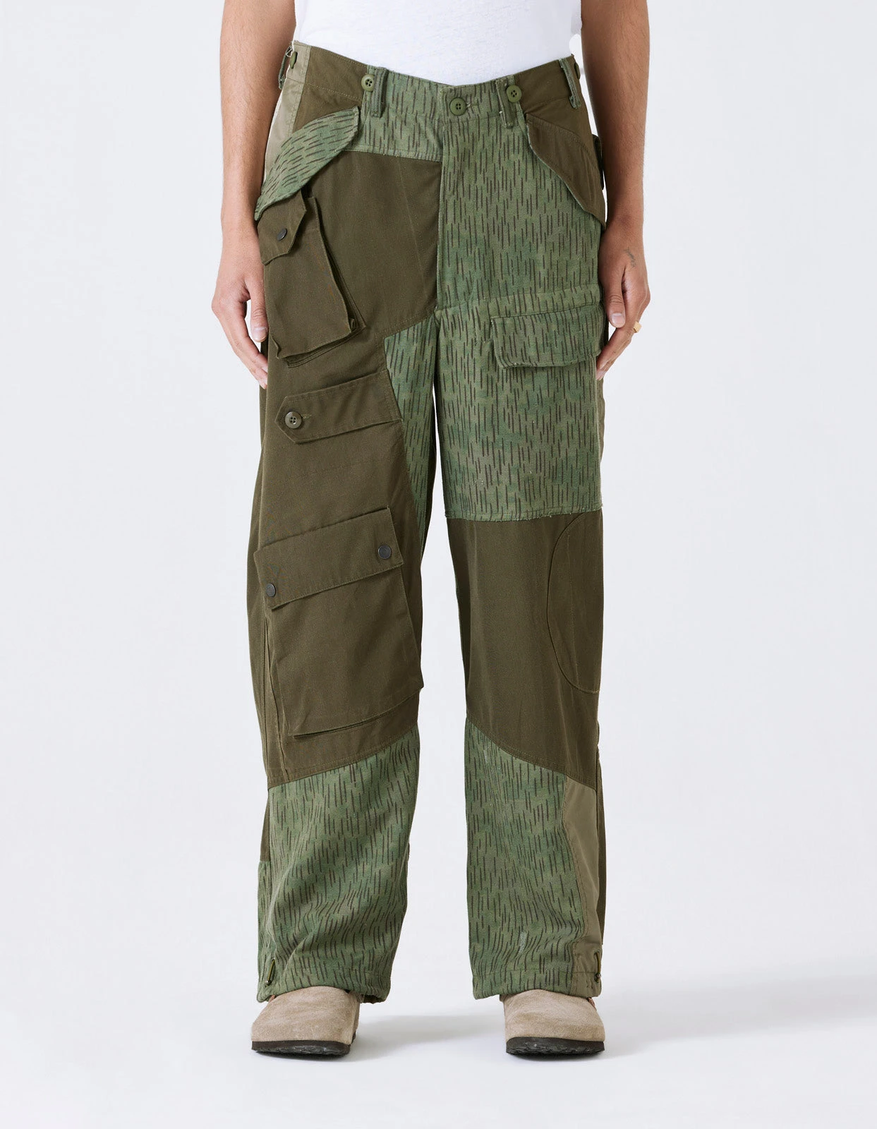 Olive cargo pants cut in a loose, wide fit. Taking cues from M65 MIL-SPEC cargo pants, constructed from a patchwork of Roma 75 jackets, Czech M60 Field Jackets, as well as reclaimed German Strichtarn DPM. Featuring an array of cargo pockets, finished with a Snocord® and temple bead hem for adjustment.