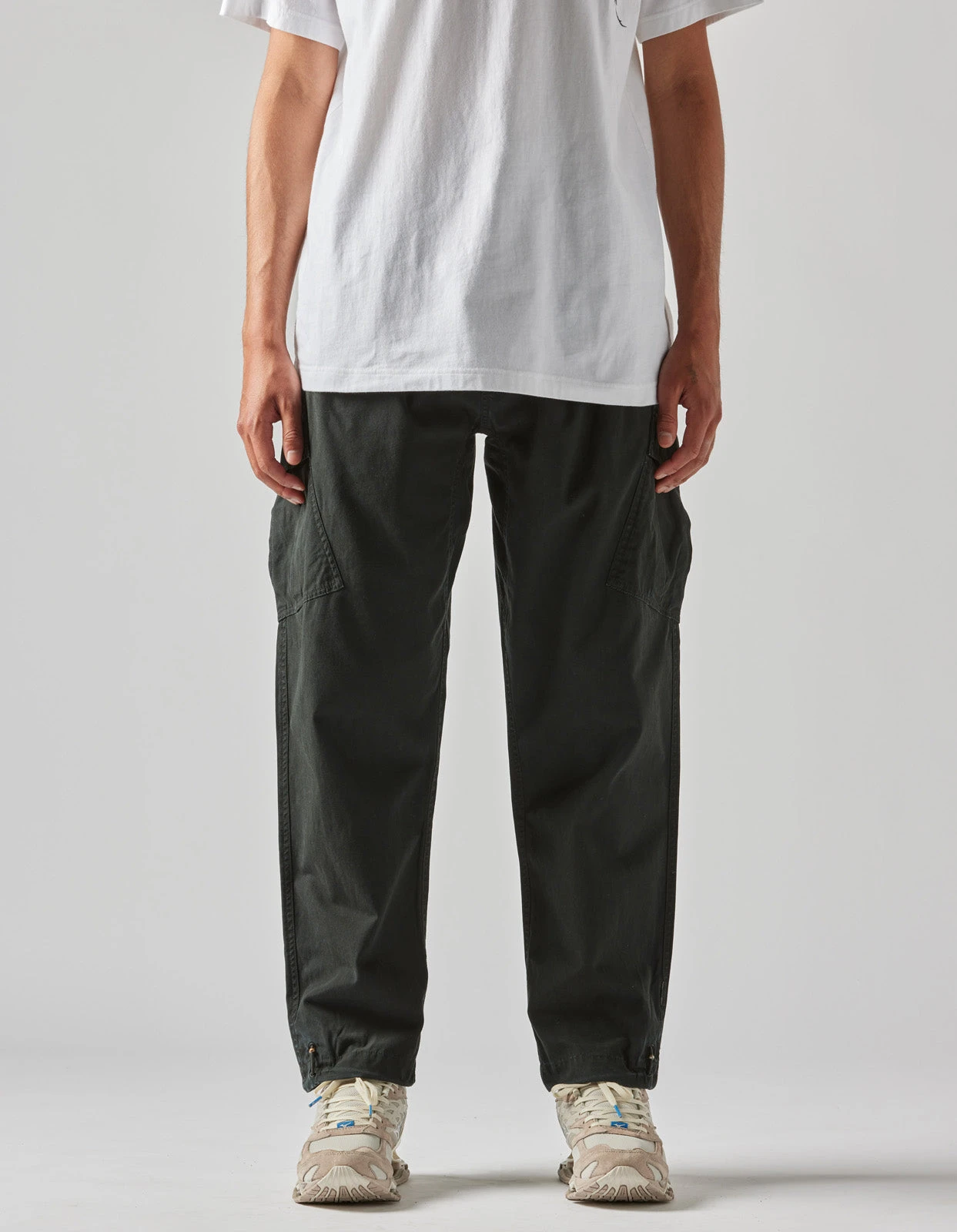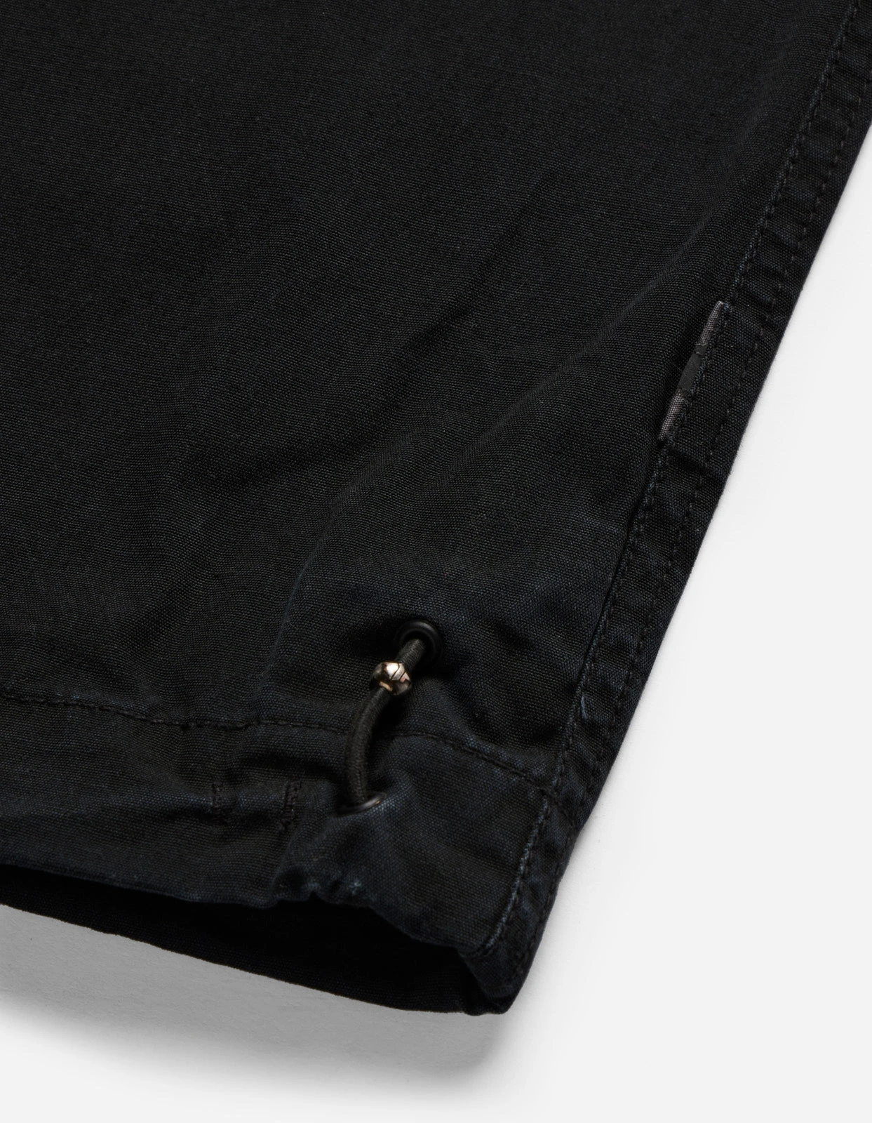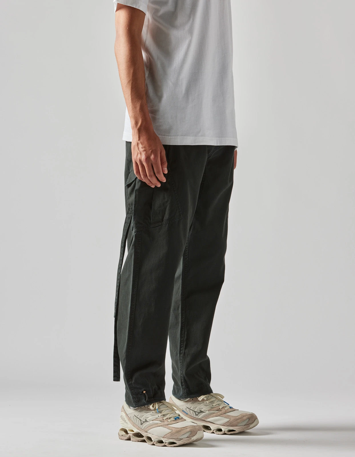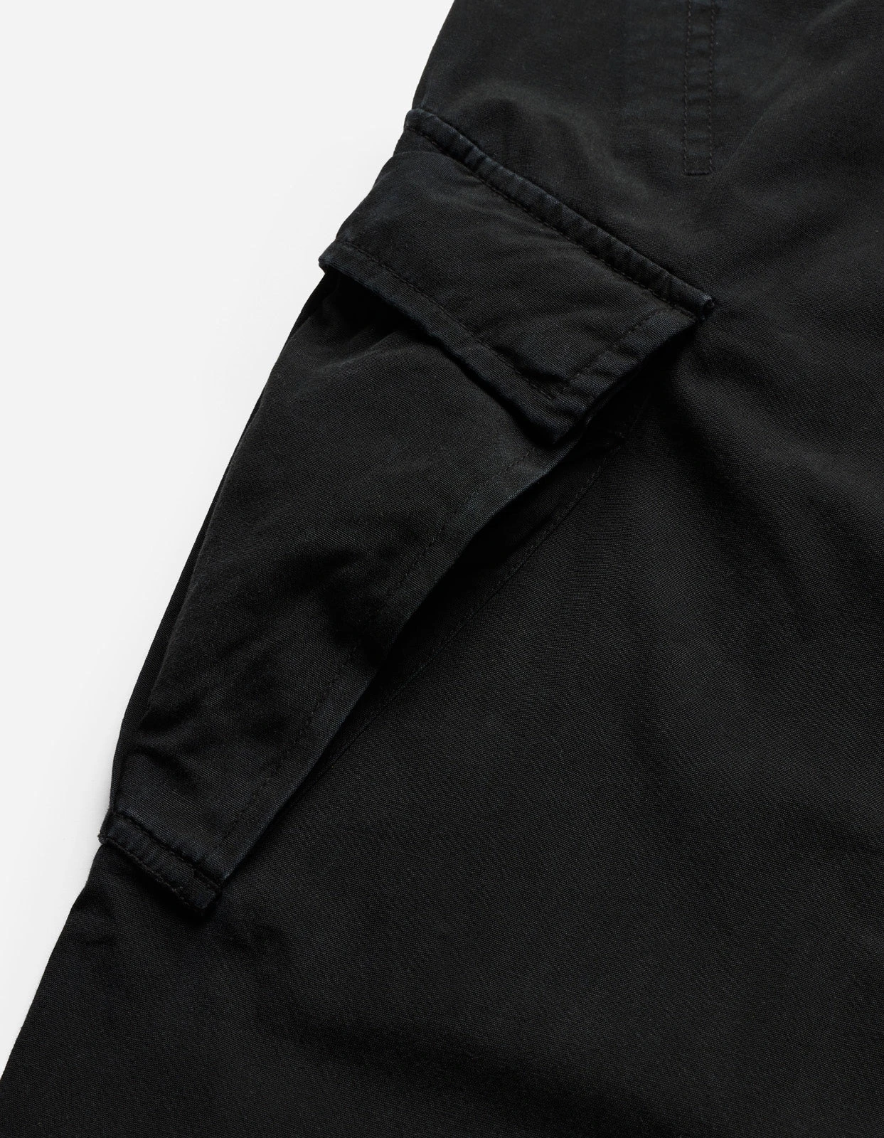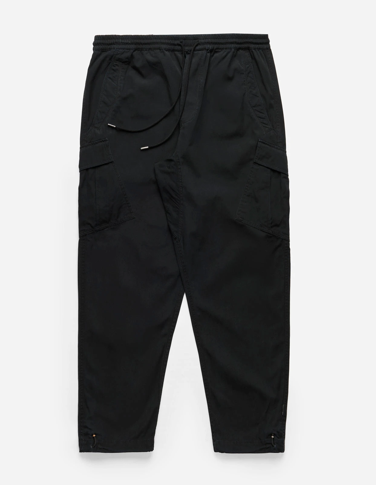 Black cargo track pants cut for a tapered fit, with drawcord waist and Temple ball and elasticated cord hem for adjustment. Drawstring adjustable waist, cargo pocket contents can be secured with leg straps, button hole allows legs straps to be optionally stowed inside the pocket. Constructed from a stonewashed Cotton Poplin.