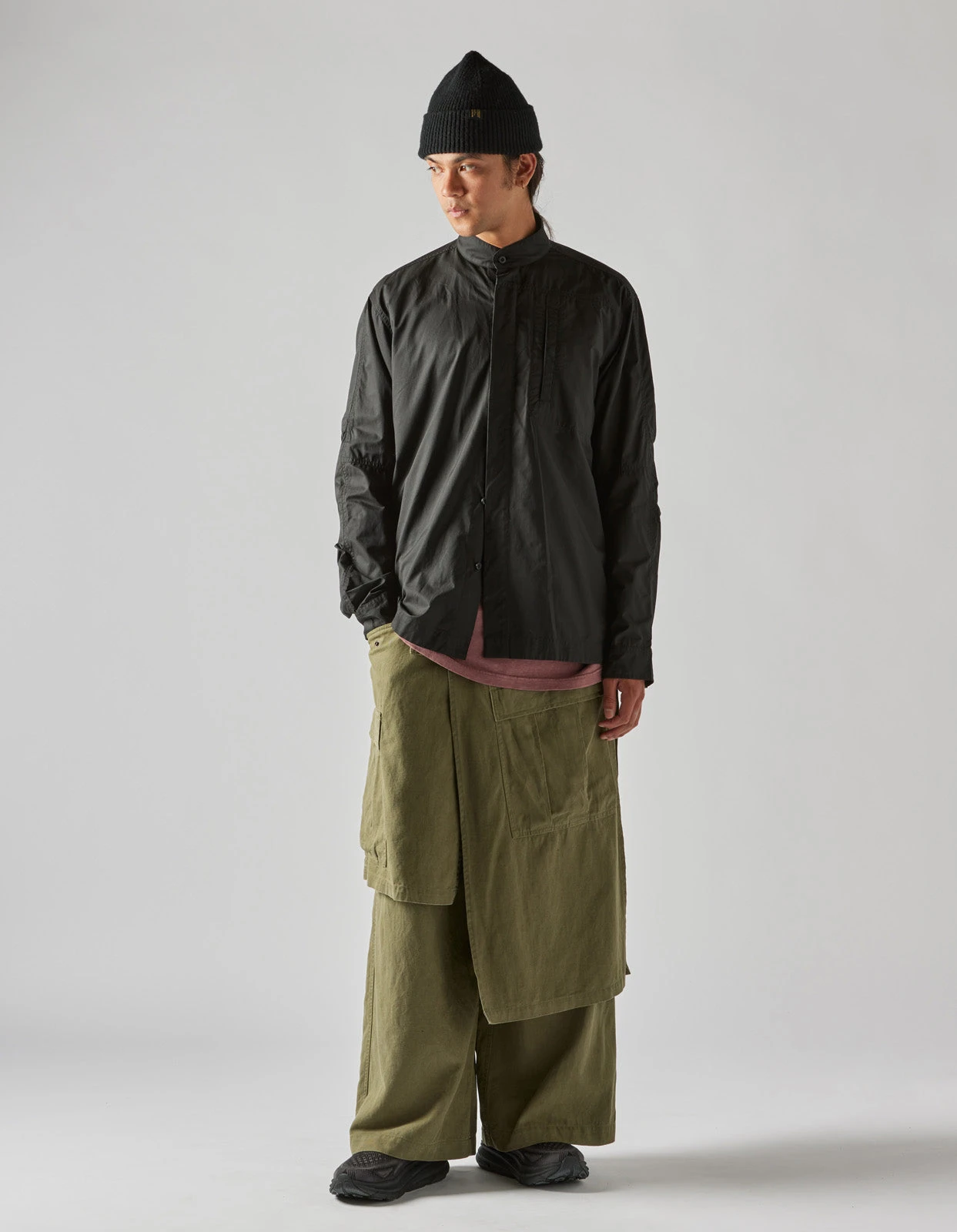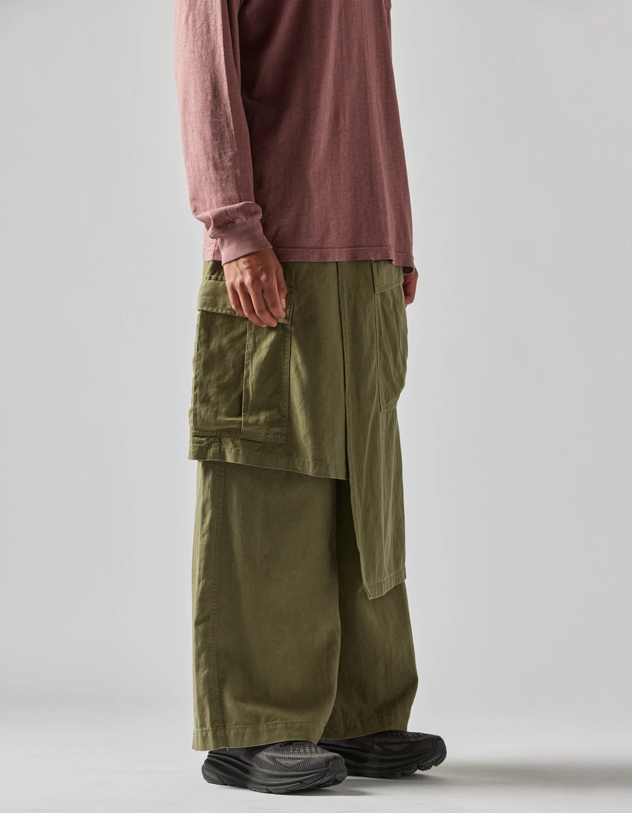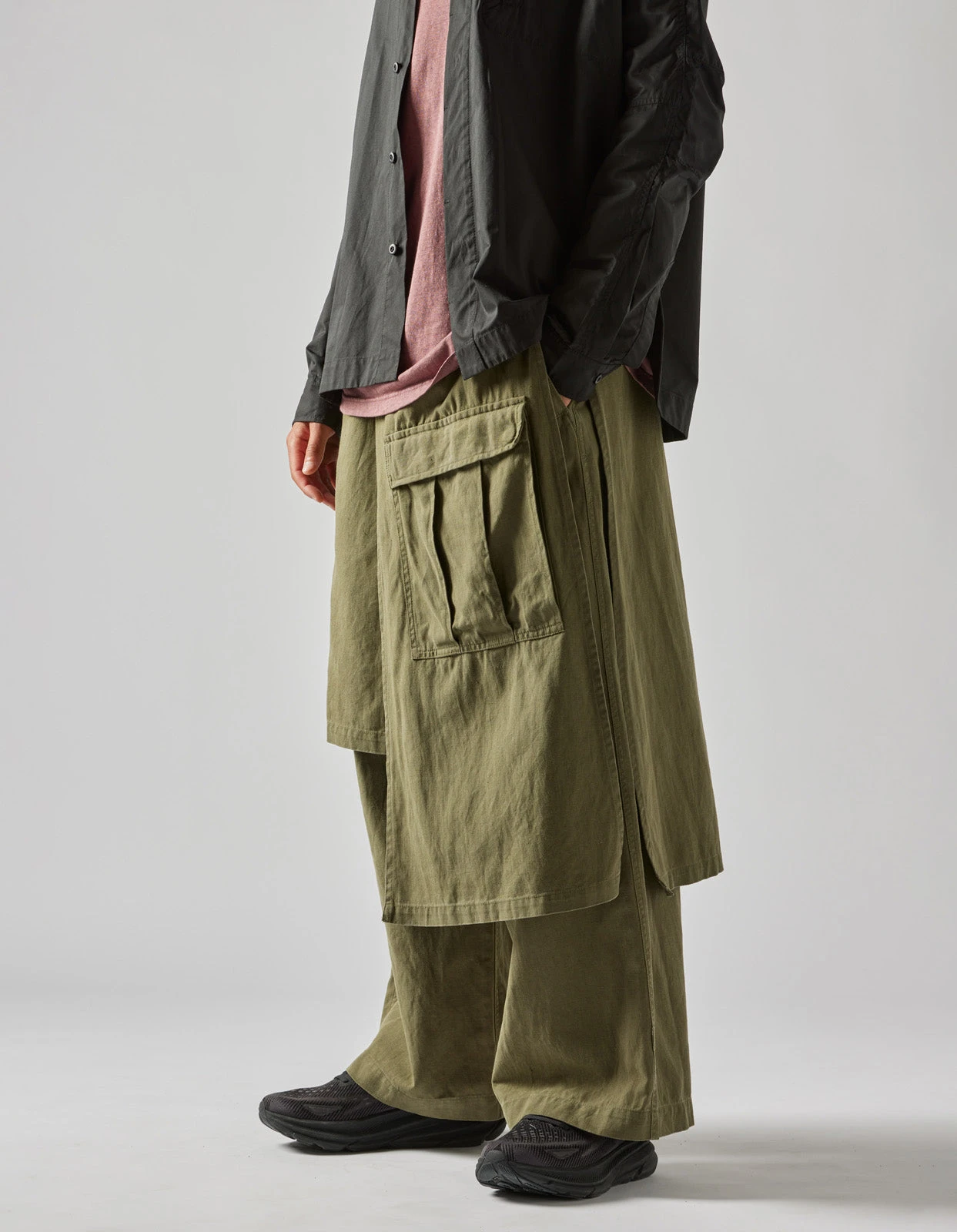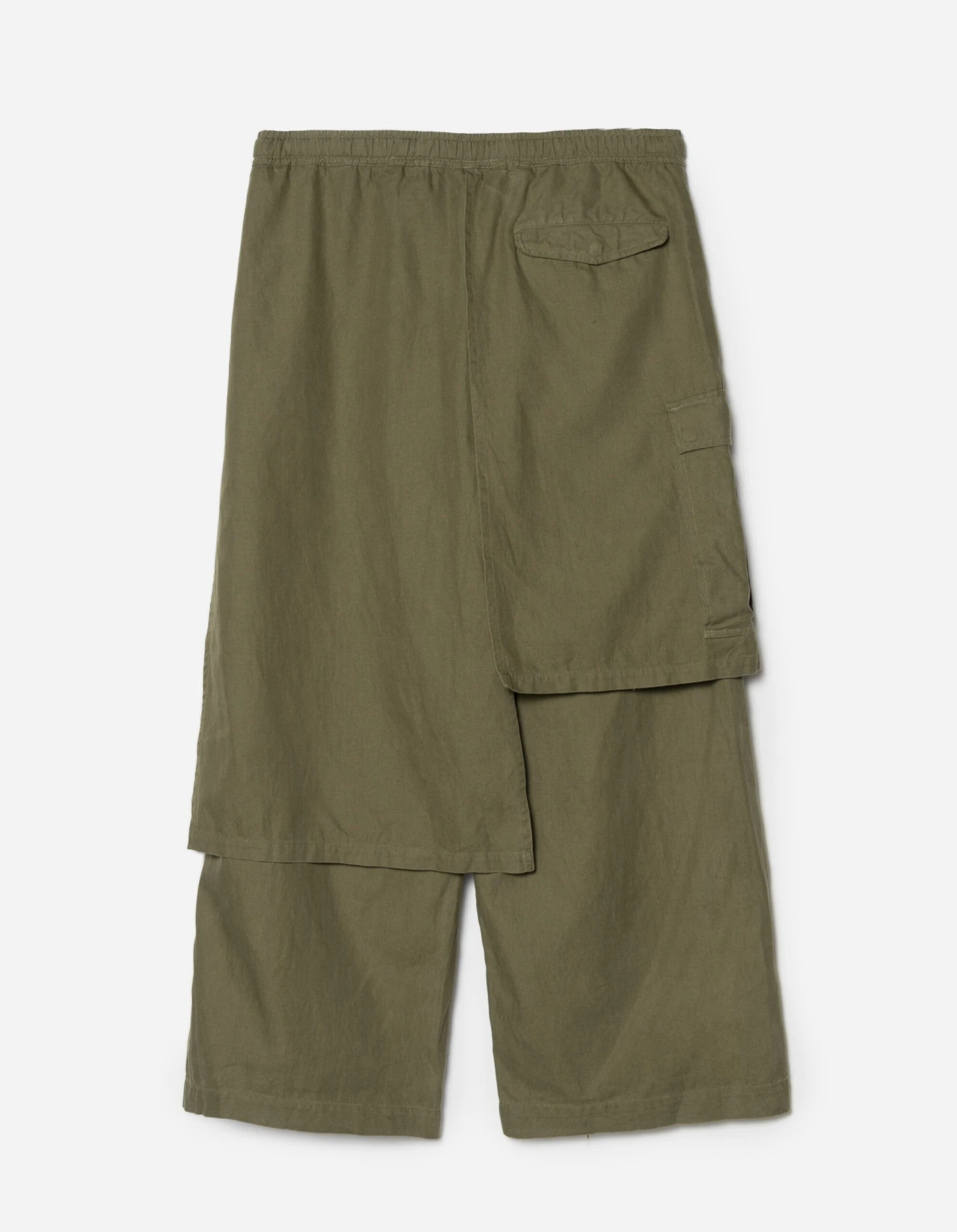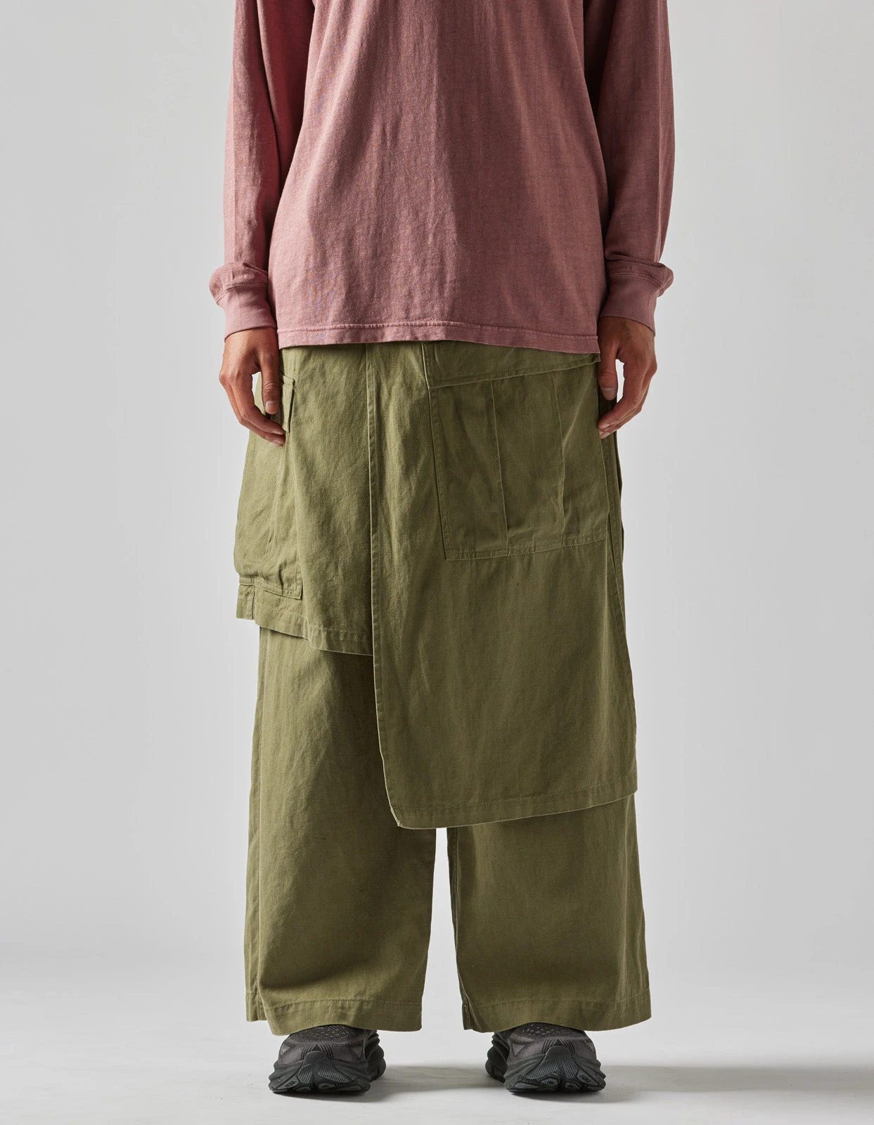 Asymmetric wide leg cargo pants, with cargo skirt layer incorporated. Cut in olive midweight hemp/cotton twill.