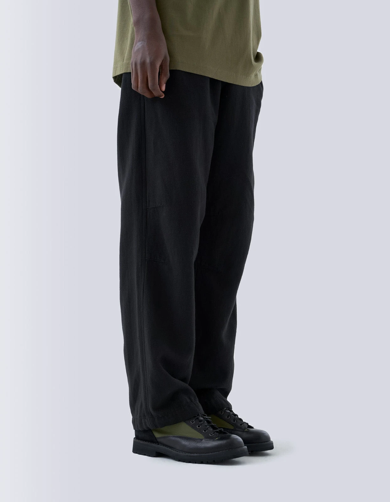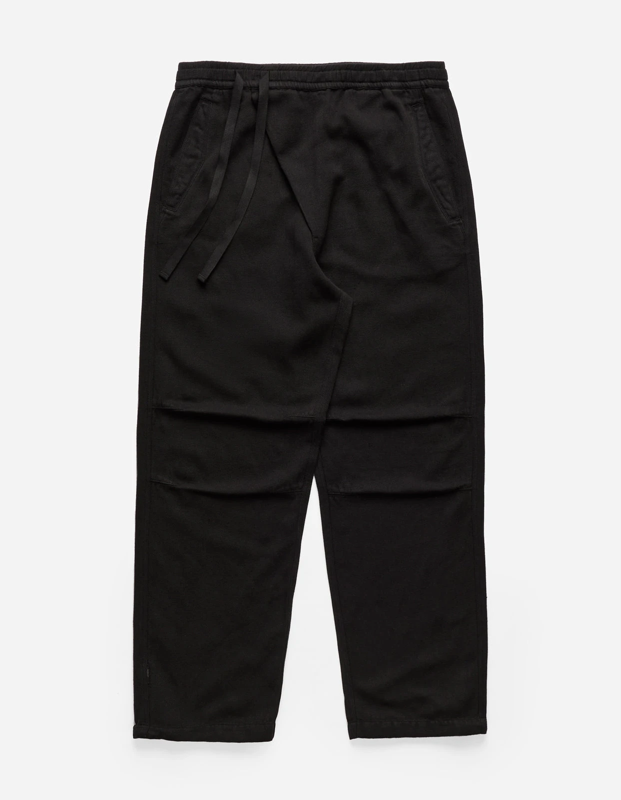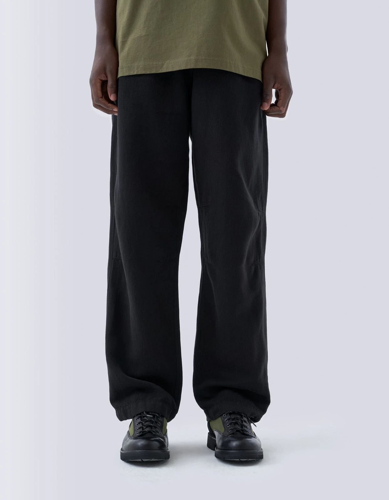 Track pants cut in a loose fit are constructed from a hemp cotton canvas, with an articulated leg shape through darts at the knee for a free range of motion. Drawcord elastic waist and hems for adjustment.