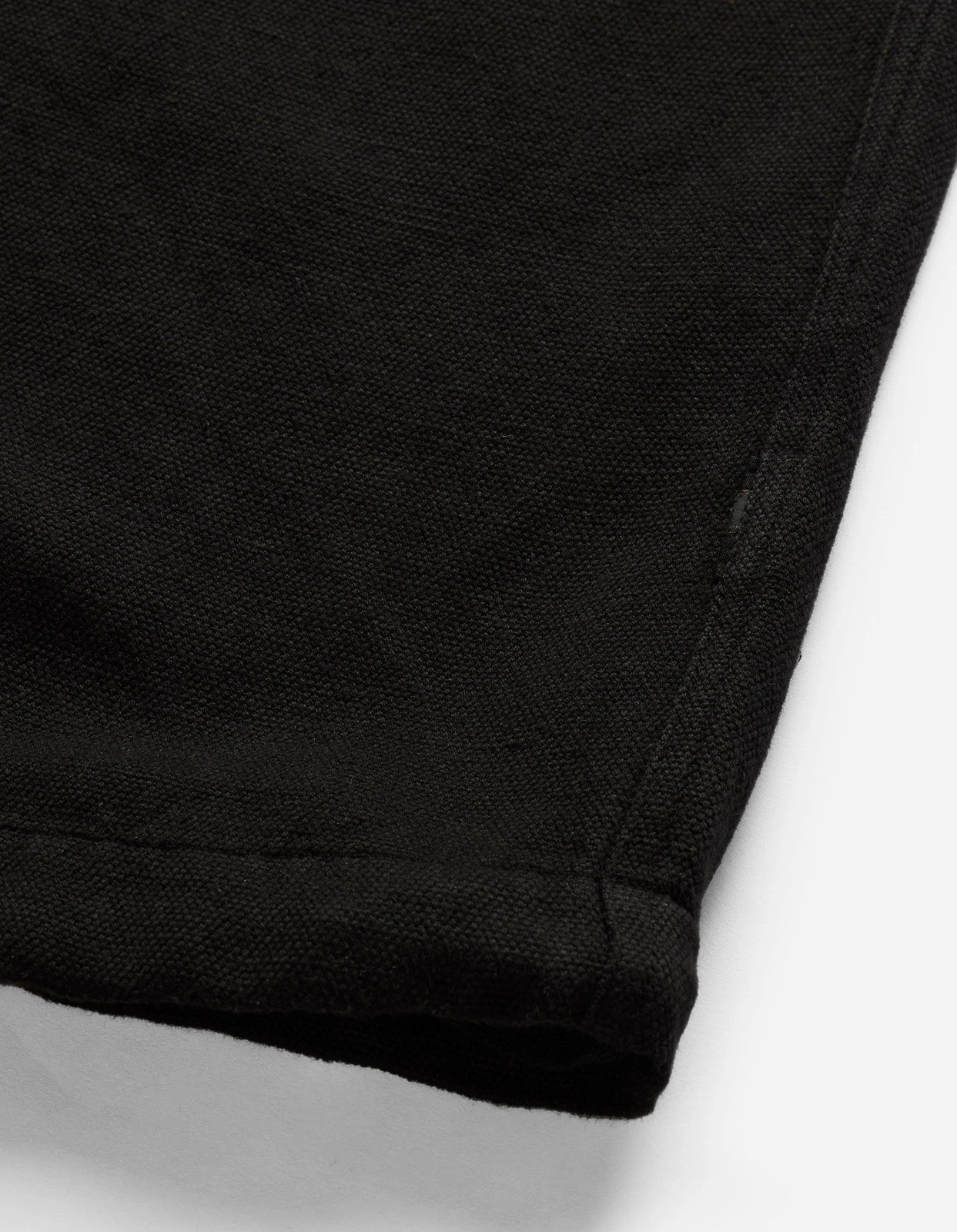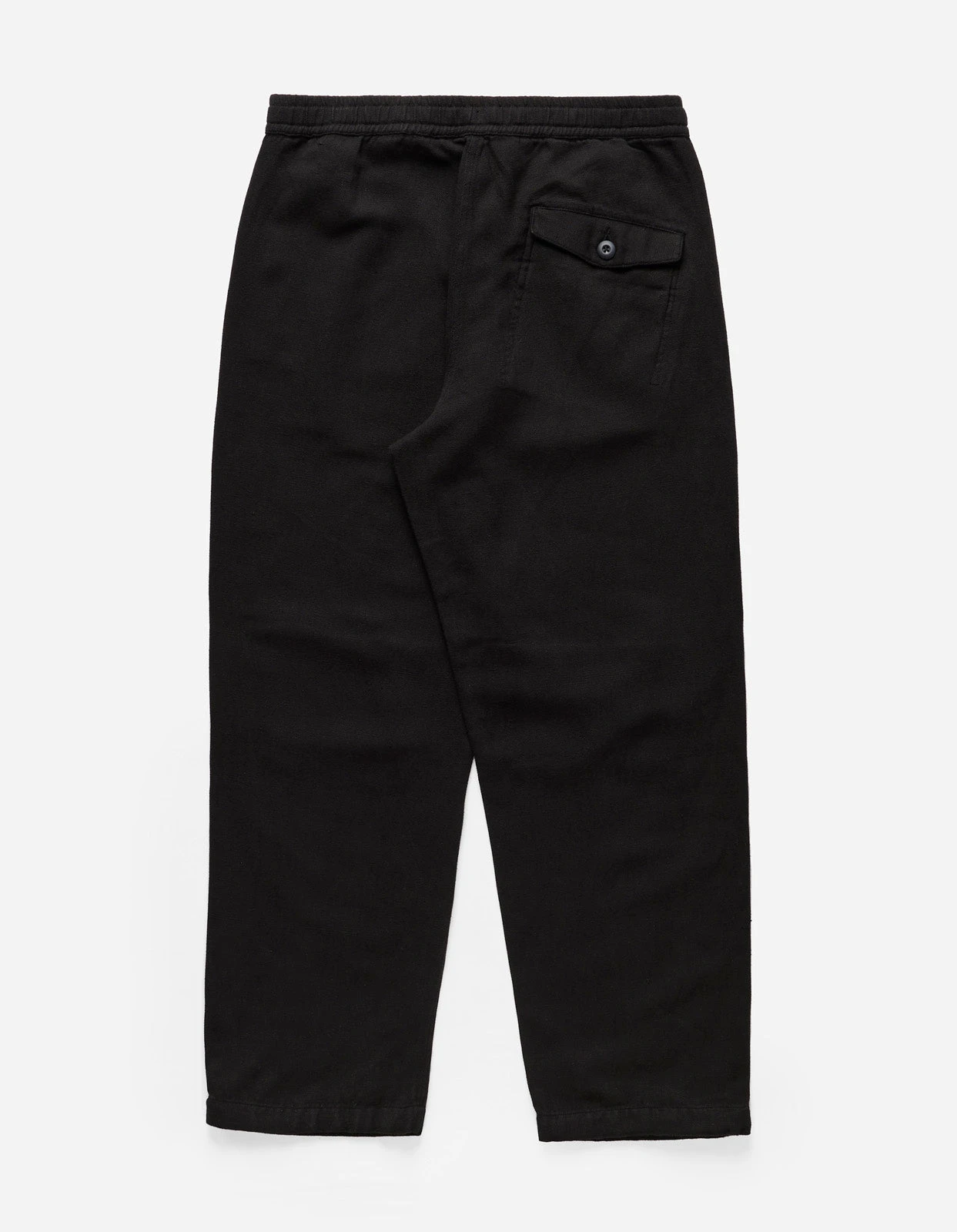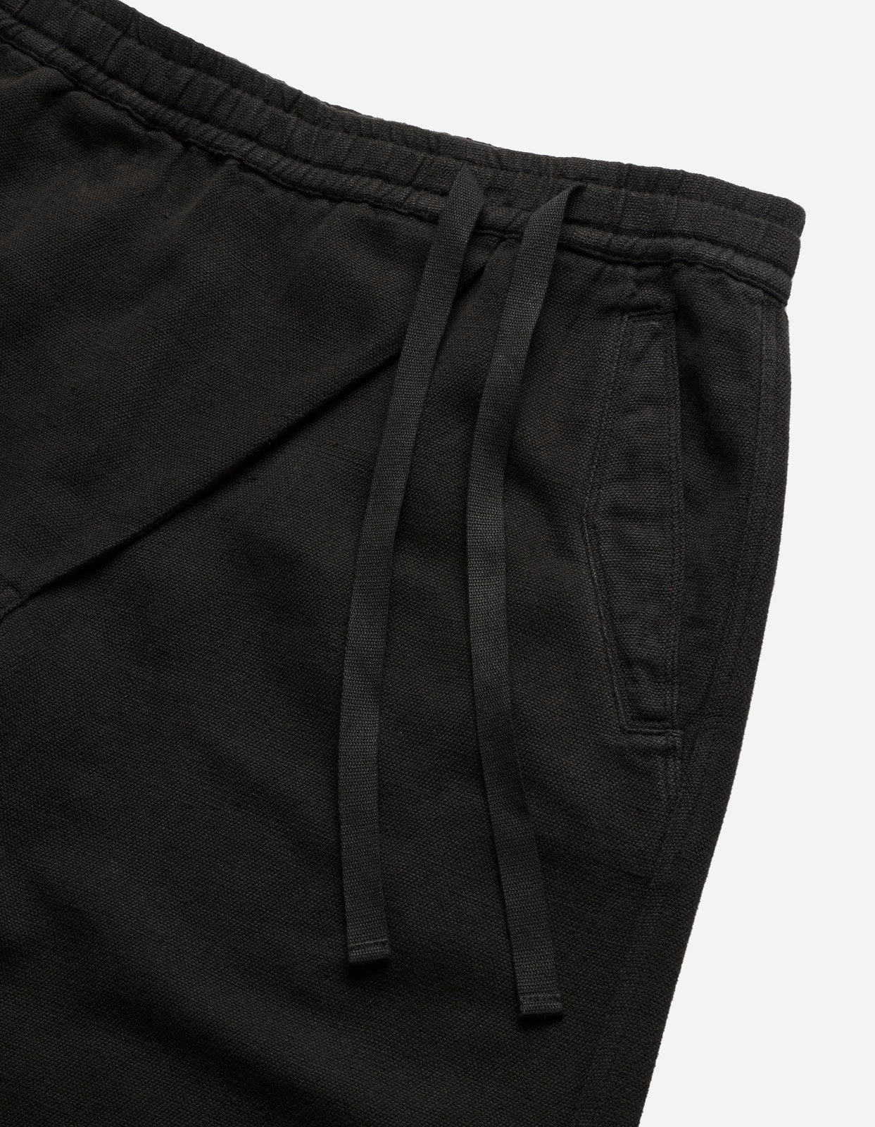 Track pants cut in a loose fit are constructed from a hemp cotton canvas, with an articulated leg shape through darts at the knee for a free range of motion. Drawcord elastic waist and hems for adjustment.
