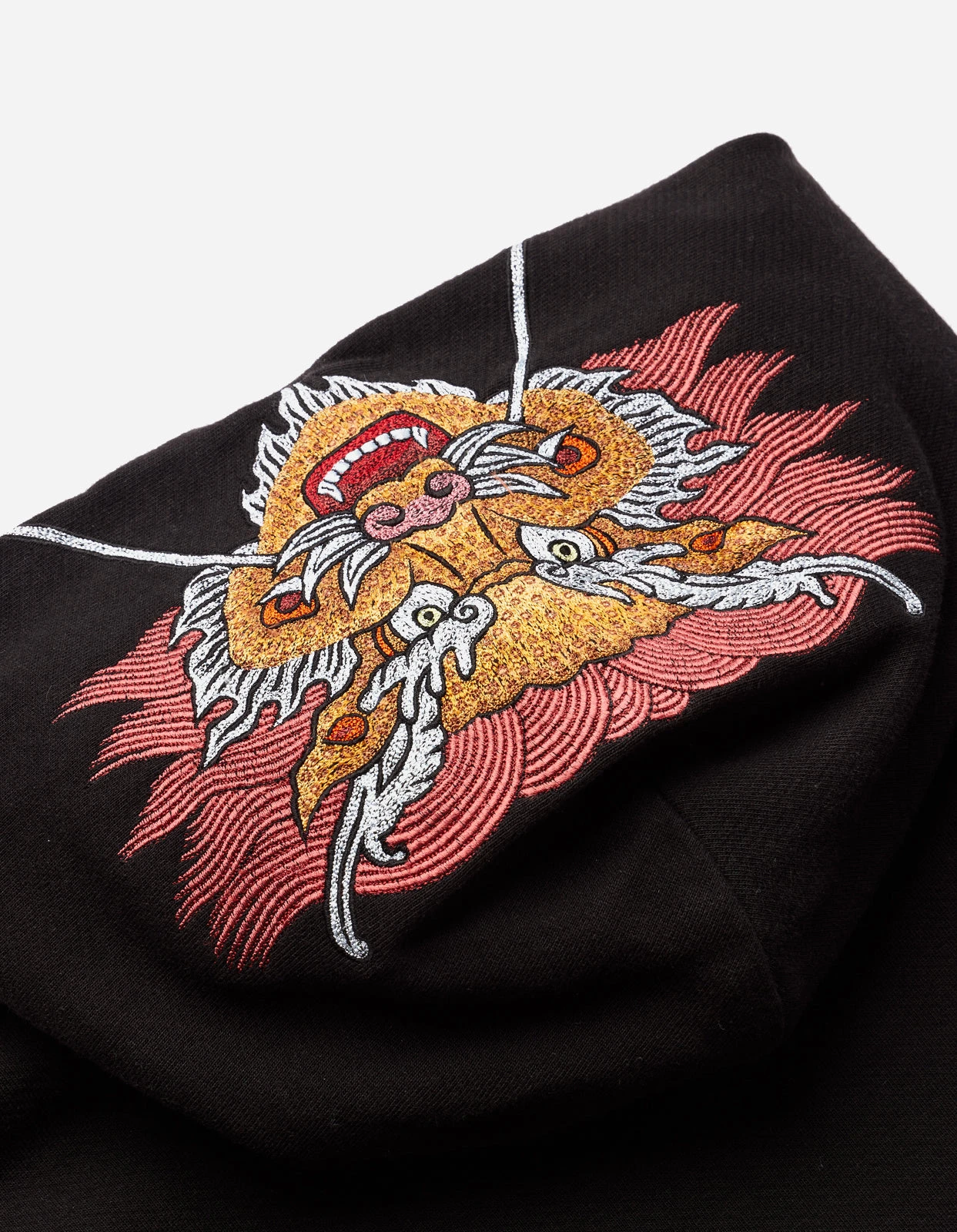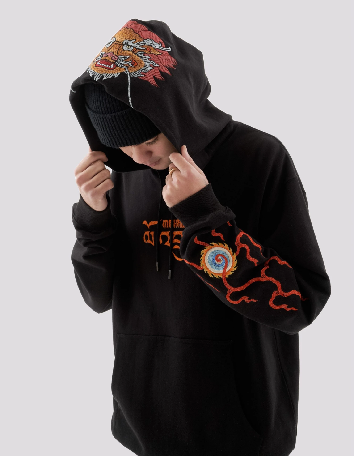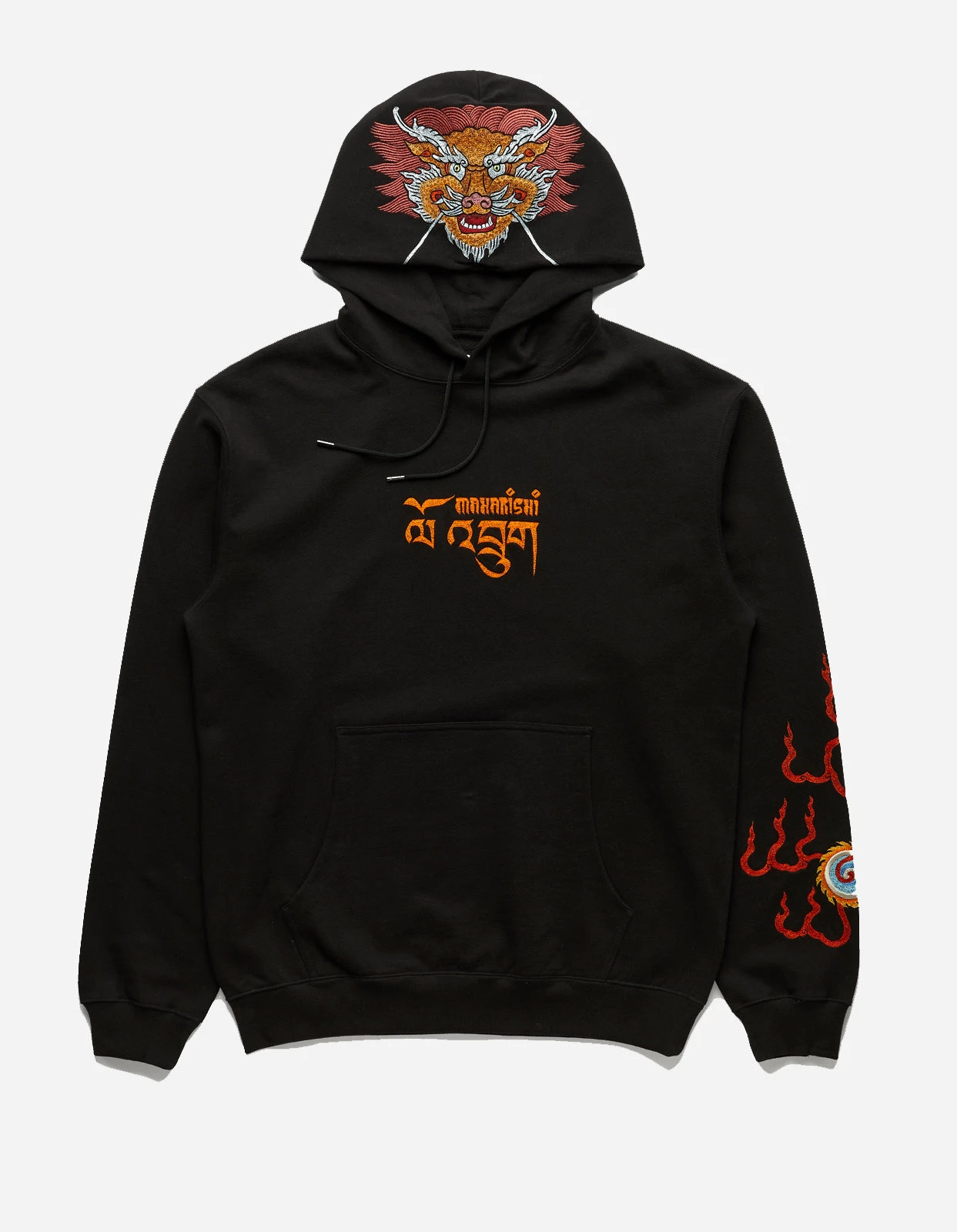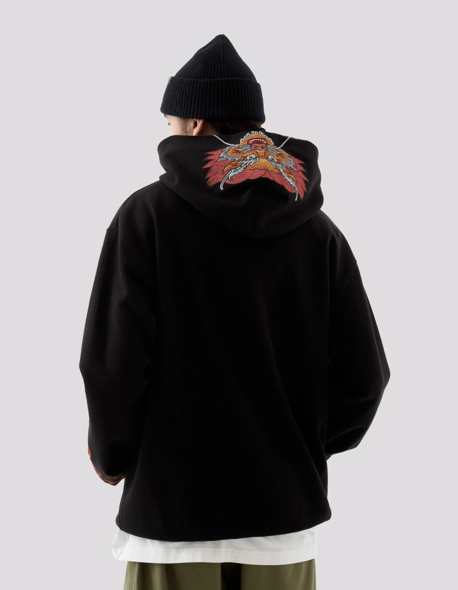 Pullover hooded sweater featuring embroidery based on multiple pieces by guest artist Tashi Mannox.