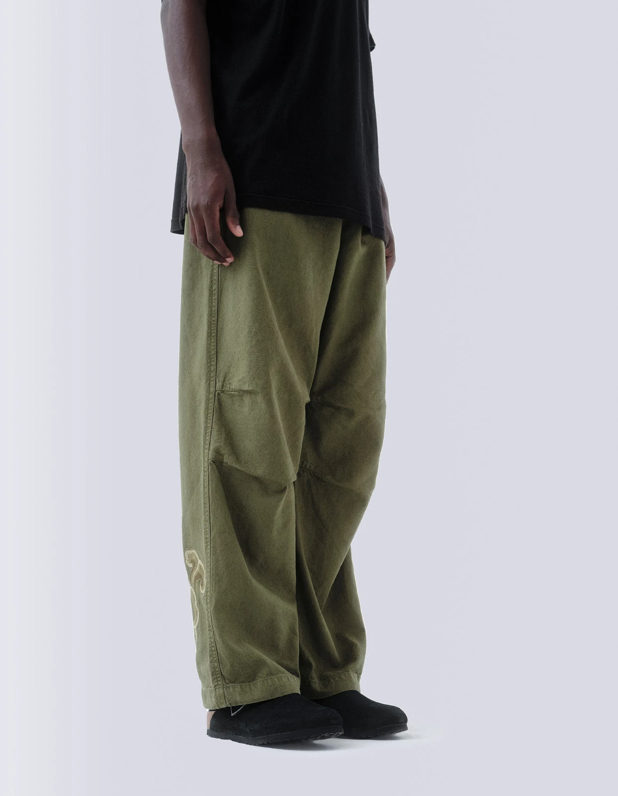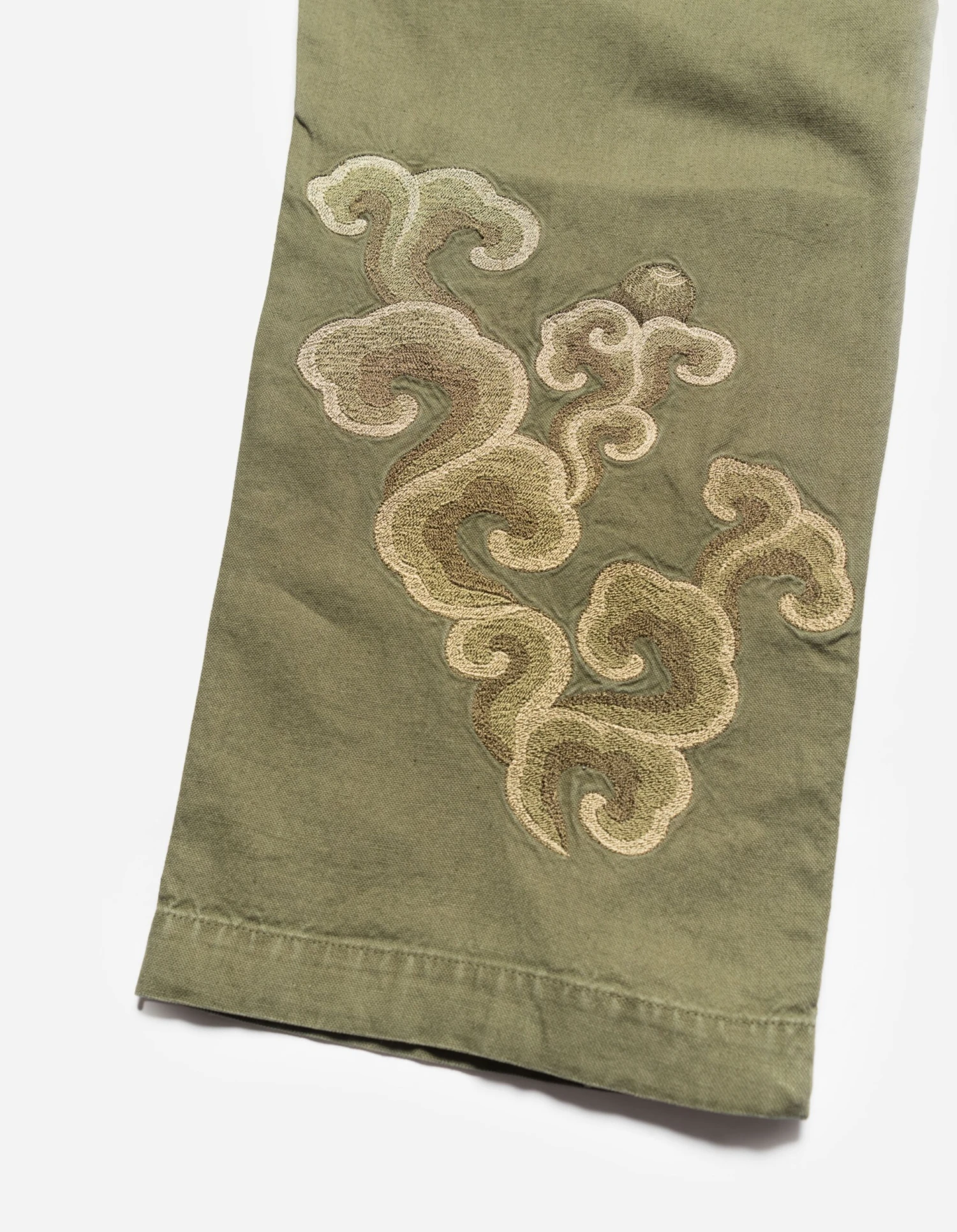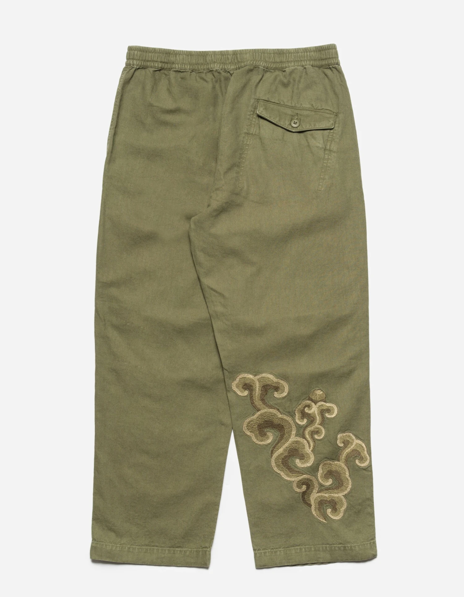 Loose fit hemp track pants with a tonal hand machined embroidery at the leg. Tibetan Thangka style clouds artworked by Tashi Mannox in celebration of the Lunar new year and the 30th anniversary.