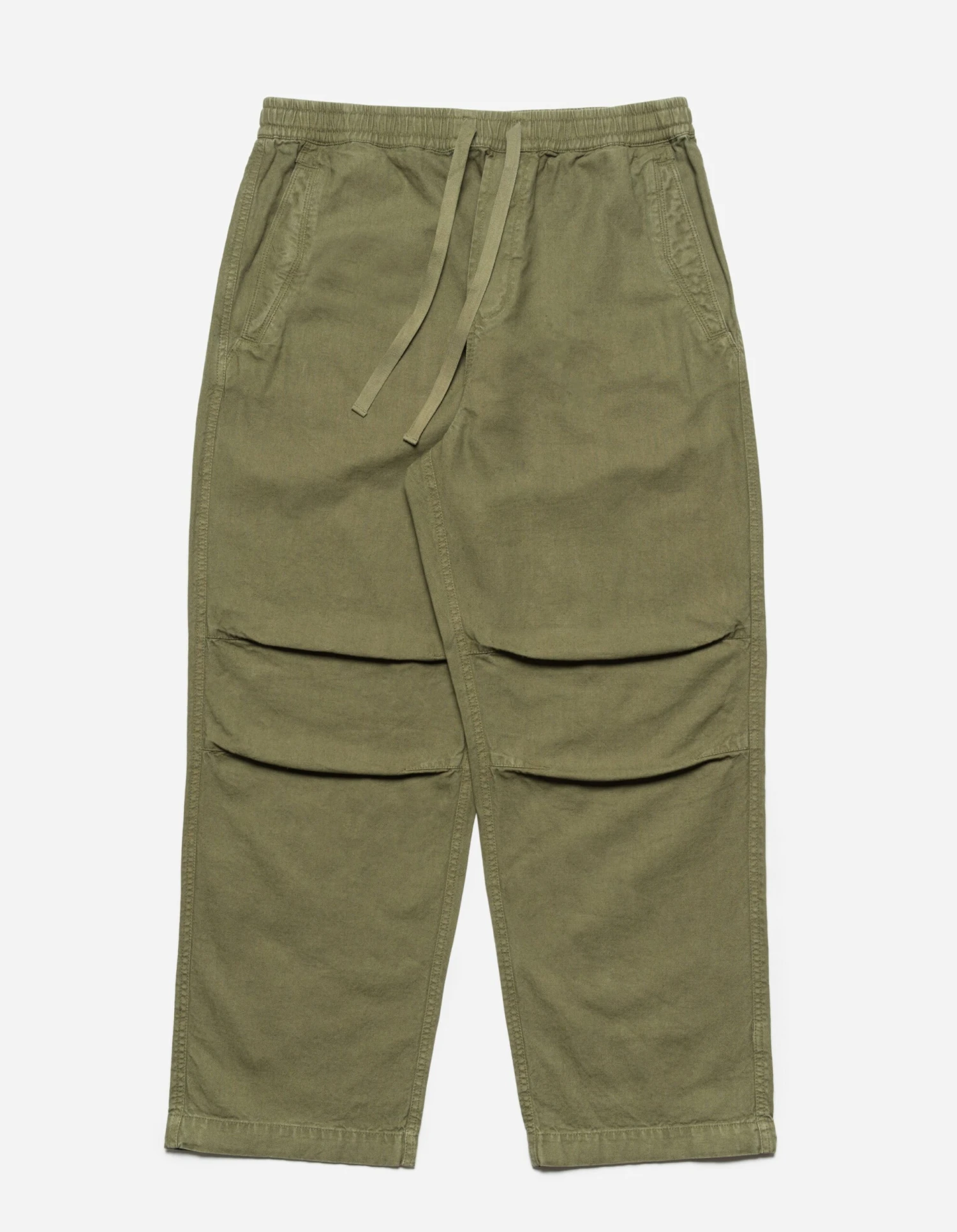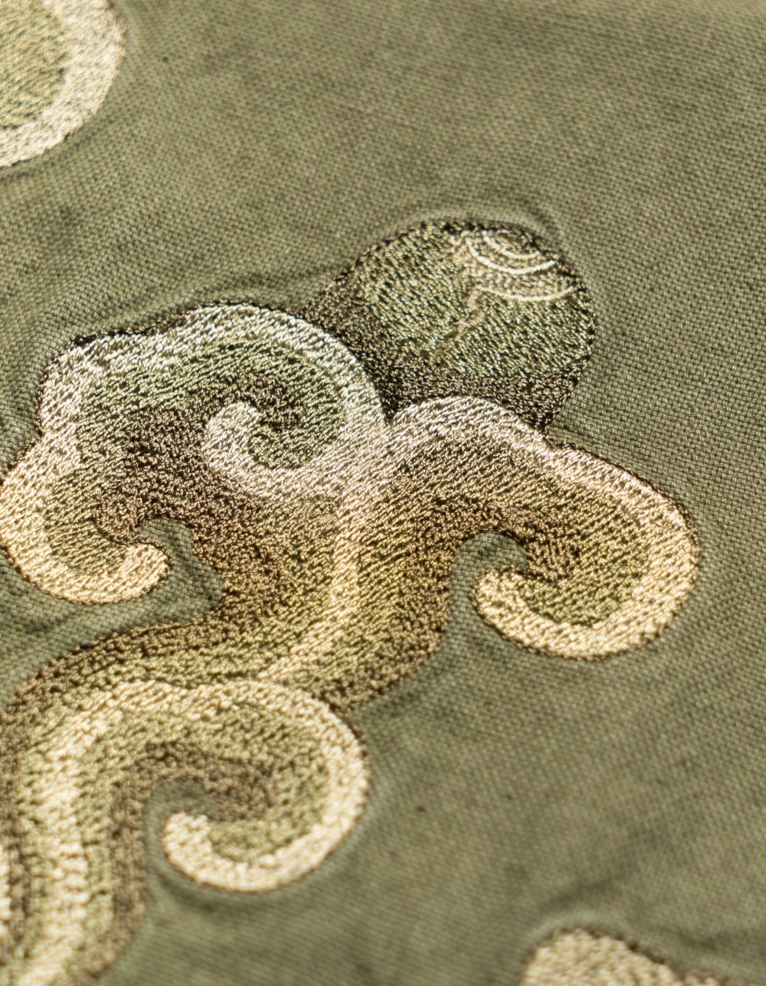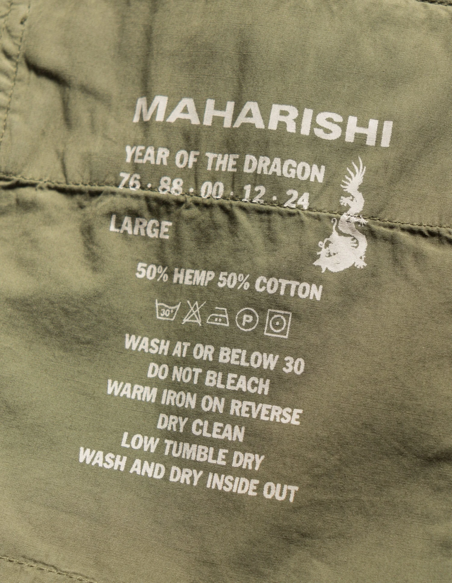 Loose fit hemp track pants with a tonal hand machined embroidery at the leg. Tibetan Thangka style clouds artworked by Tashi Mannox in celebration of the Lunar new year and the 30th anniversary.