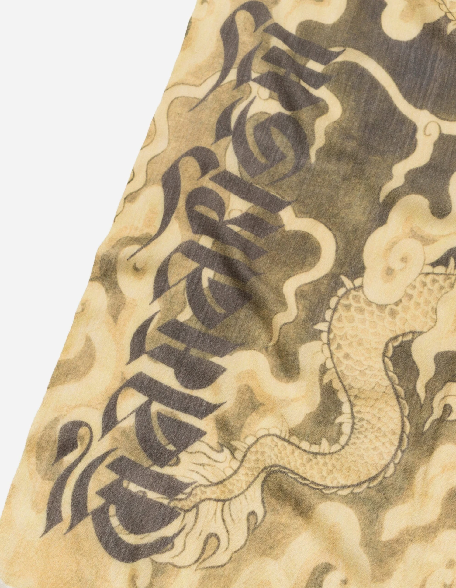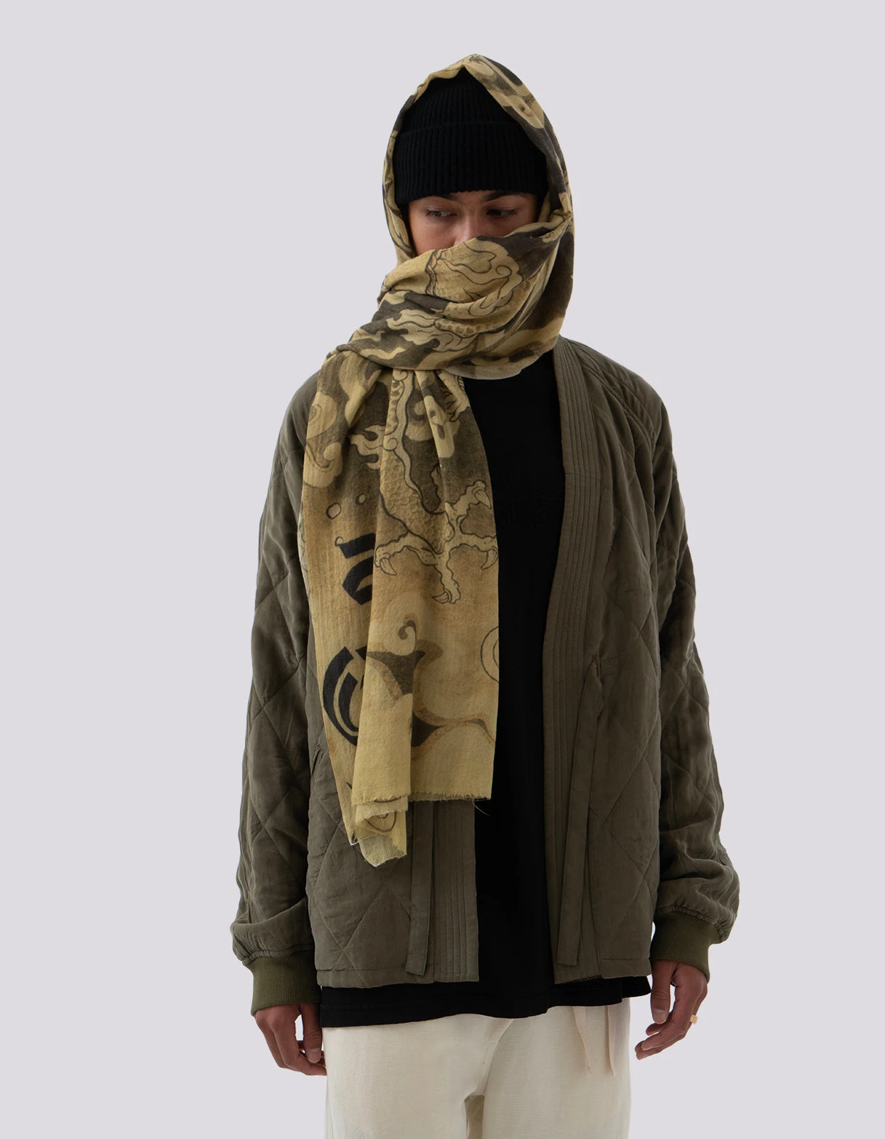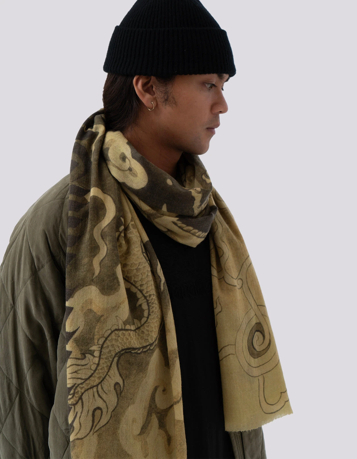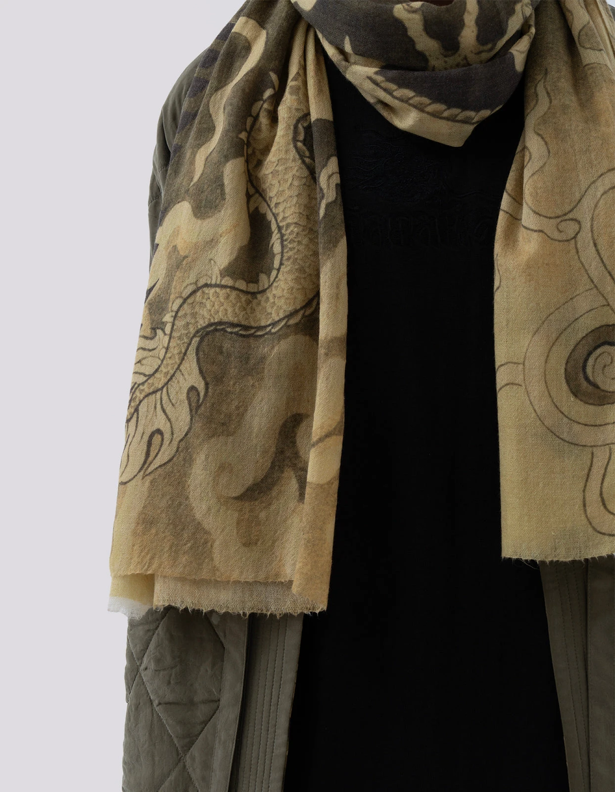 Large cashmere scarf, features an all over tonal dragon print to celebrate Maharishi’s 30th anniversary.