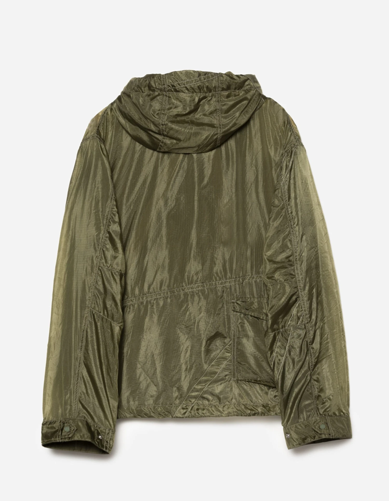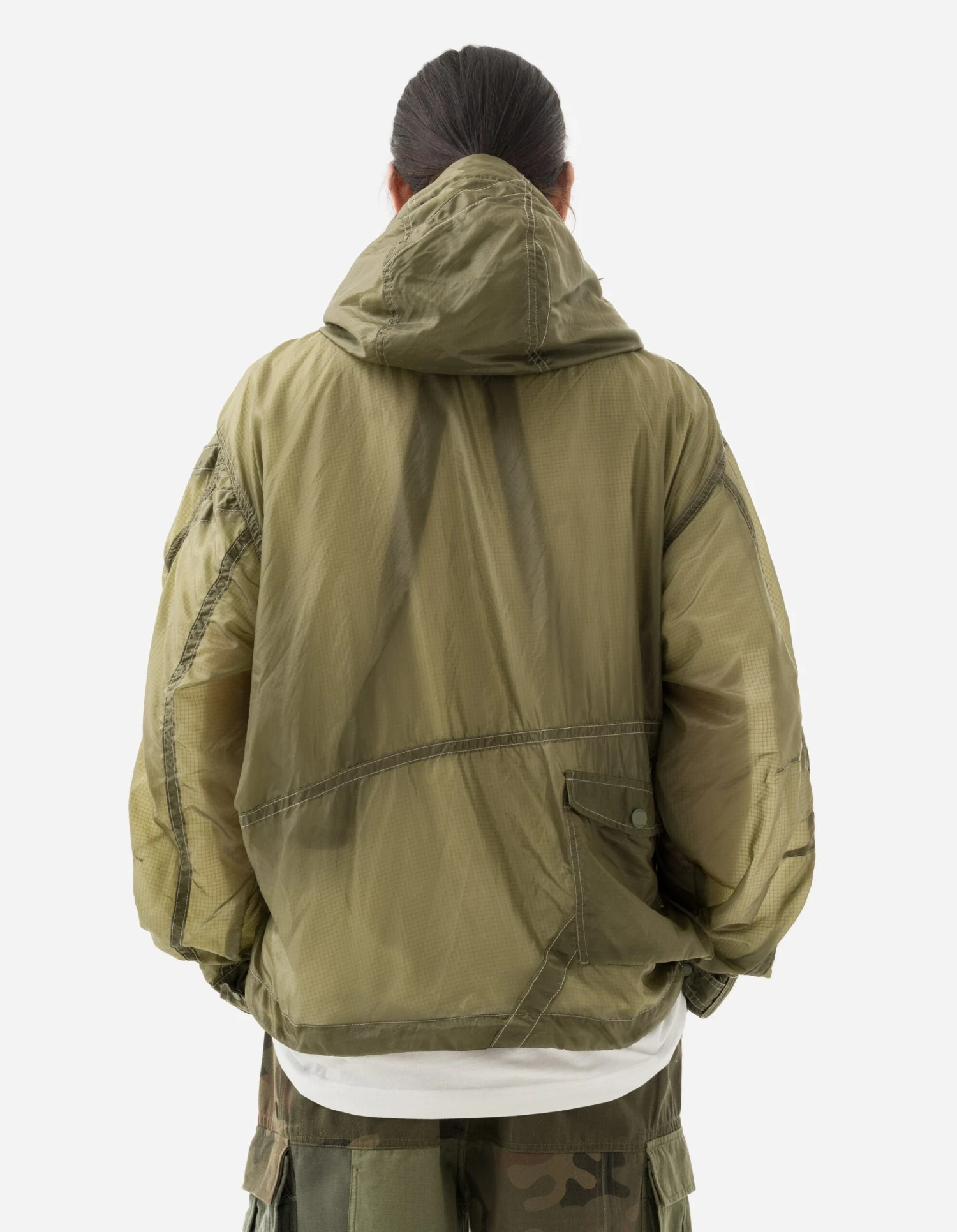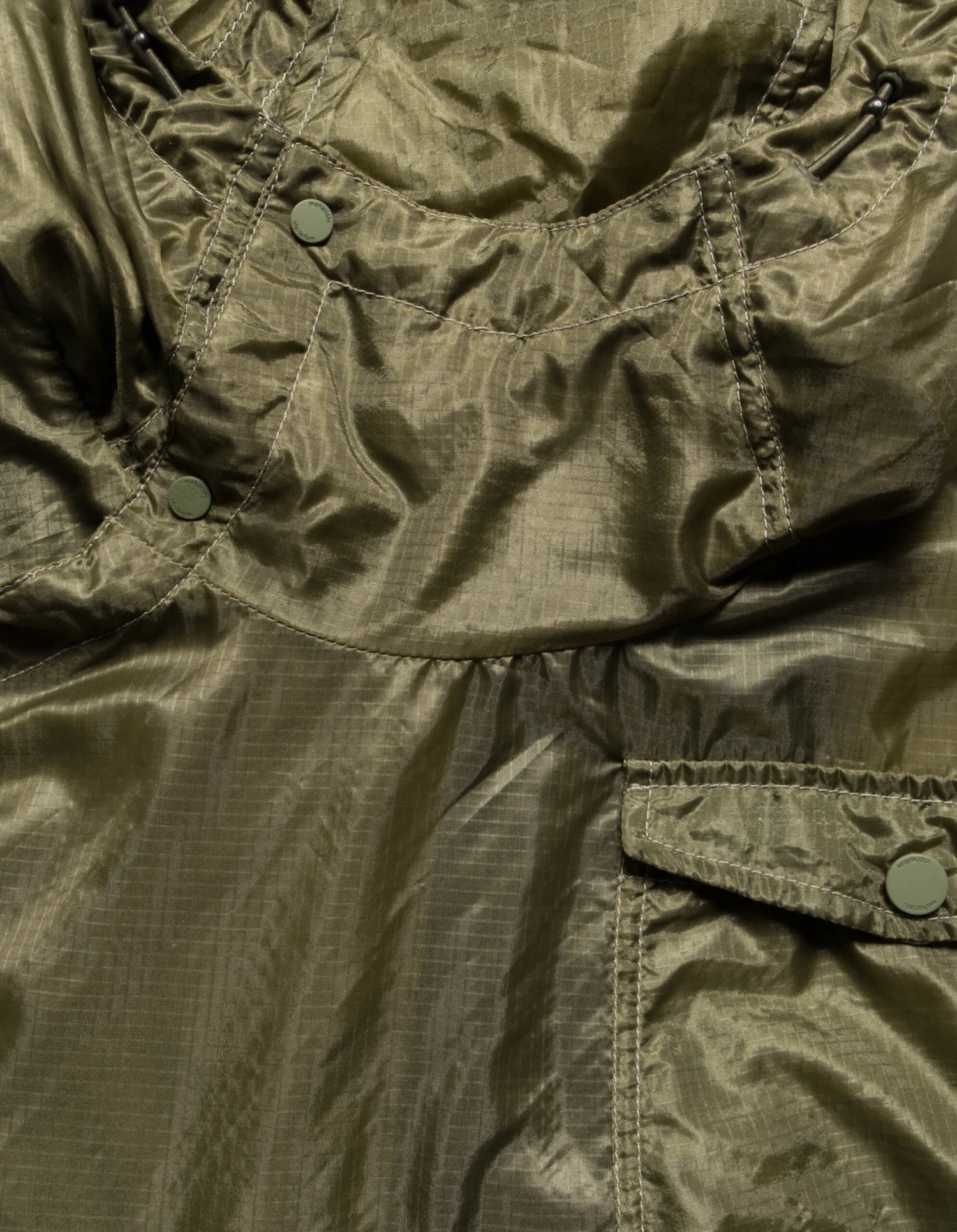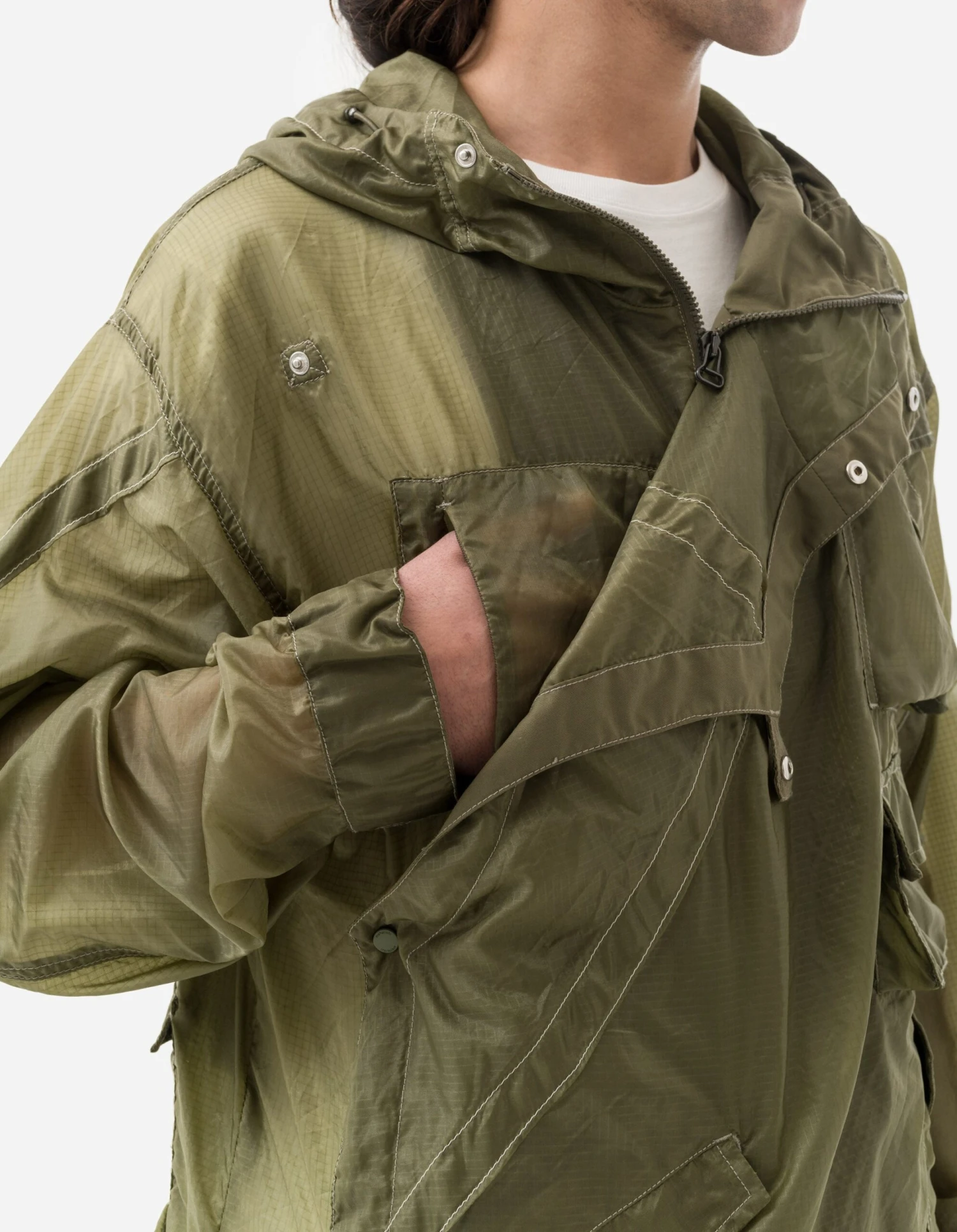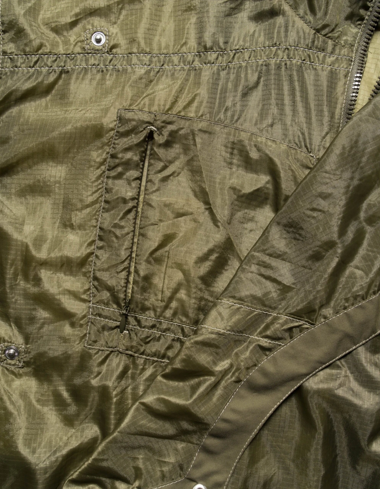 Snoparka based on a US Army design is constructed from upcycled military parachute surplus and combines a Buddhist monk inspired front wrap closure.