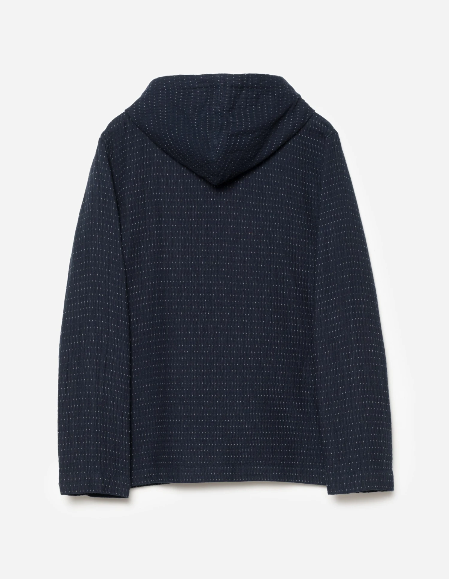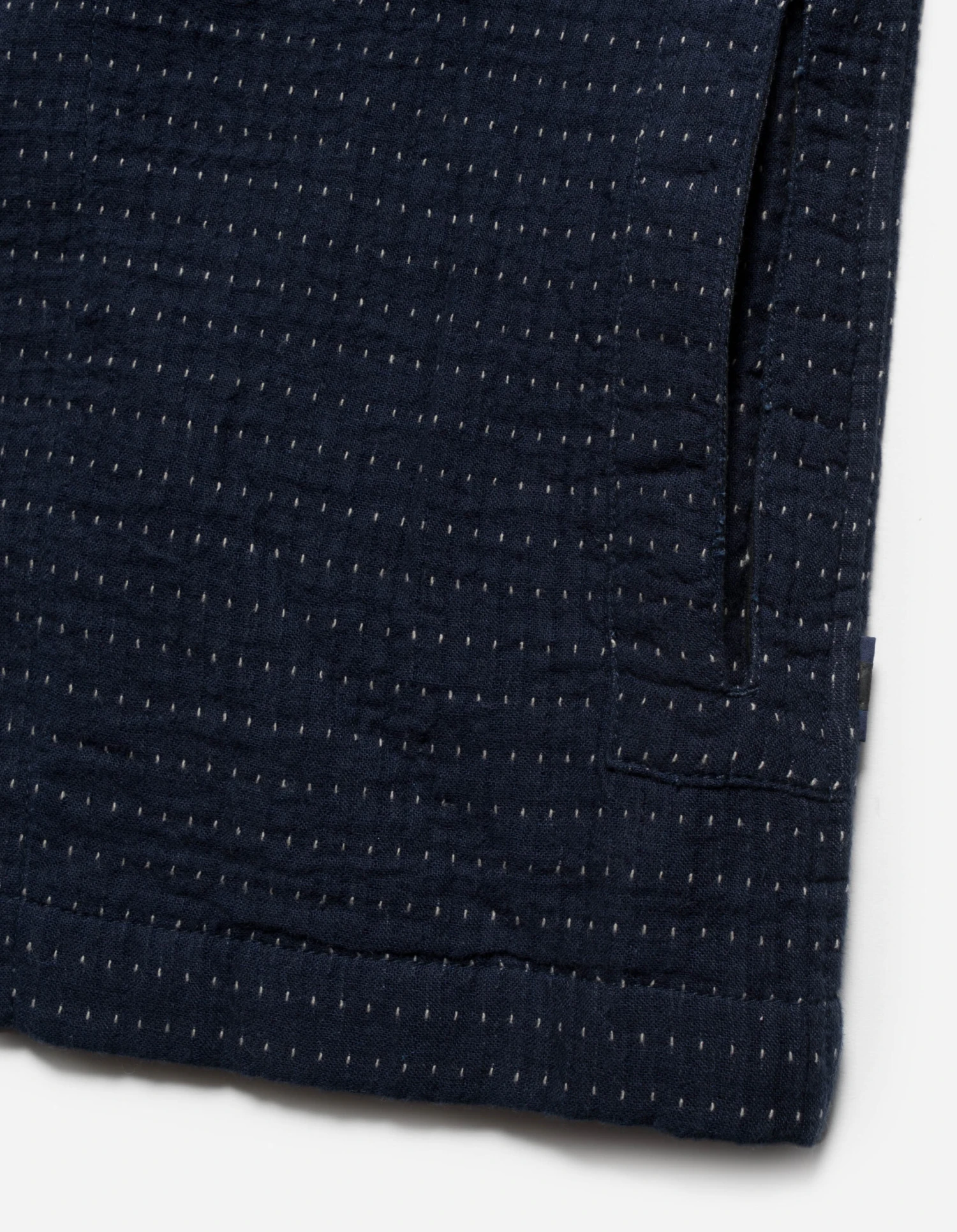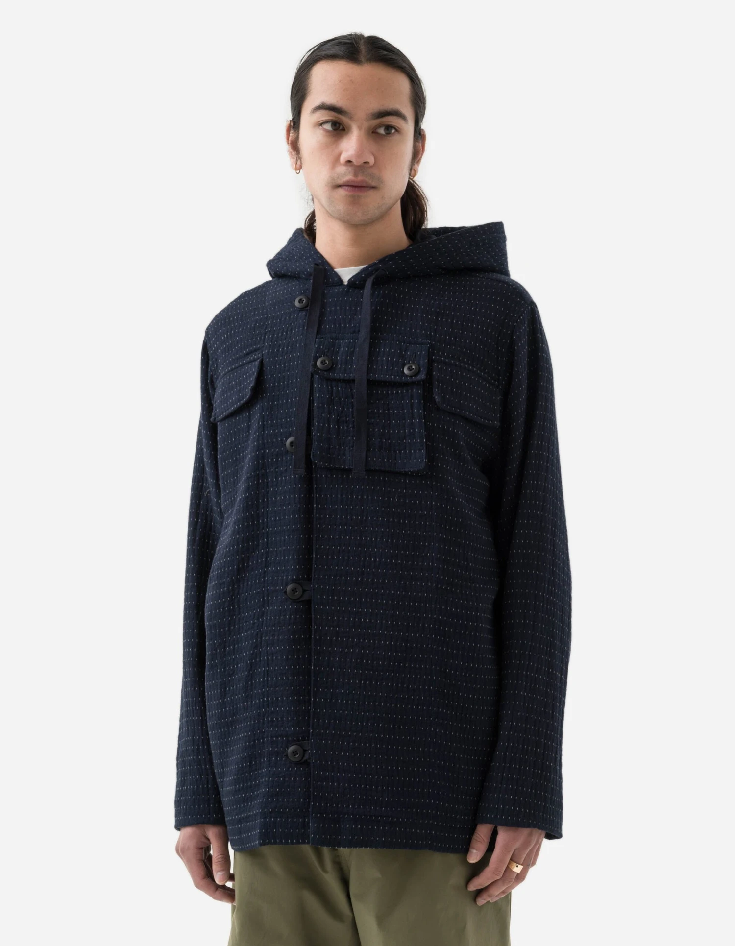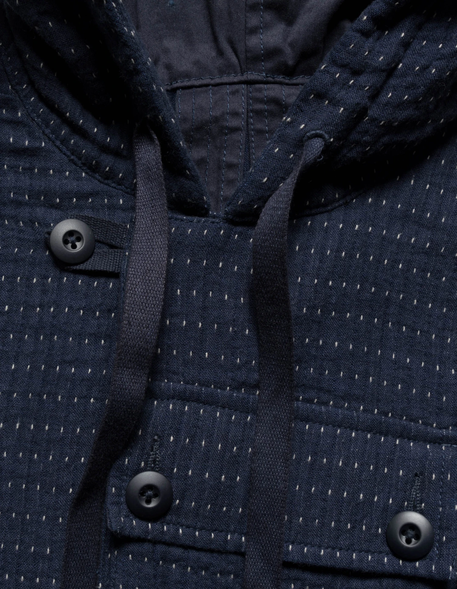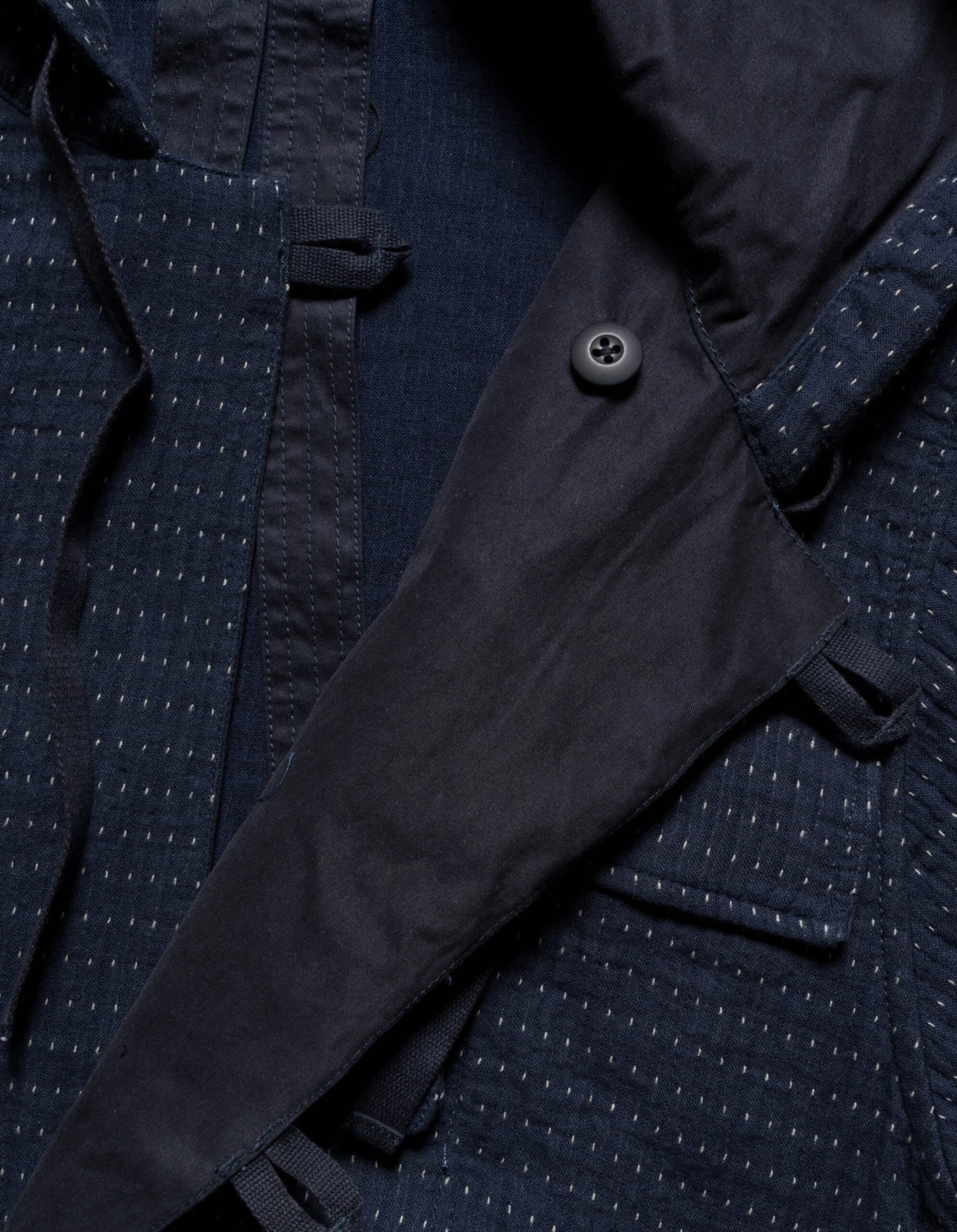 Smock parka, based on a West German military design fitted with a centred chest pocket, and overlap buttoned placket reconstructed in a indigo dyed Kantha cotton.