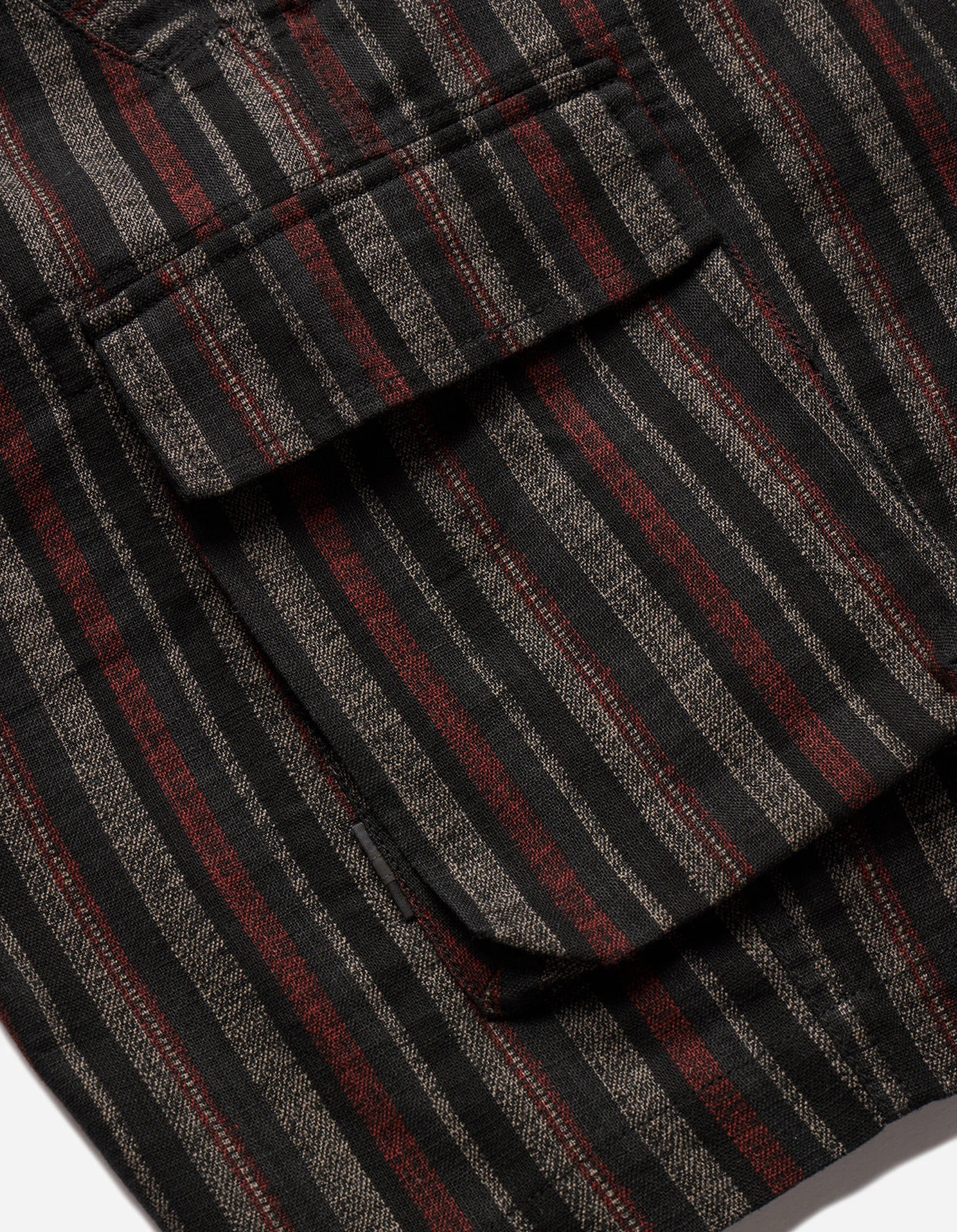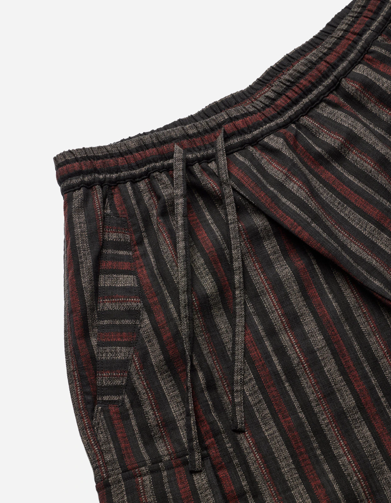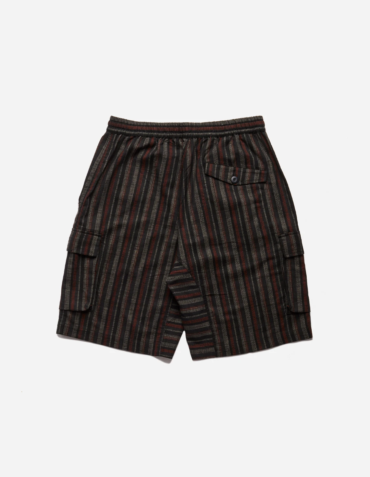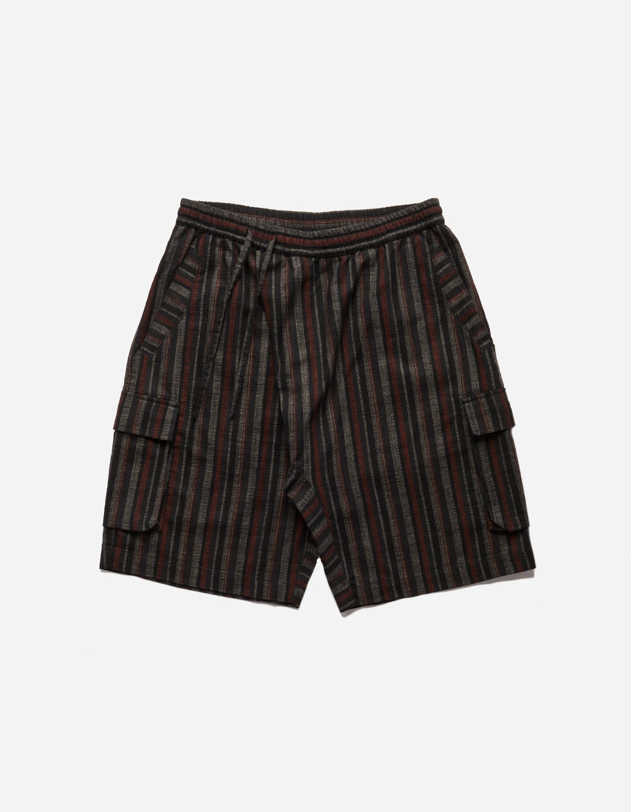 Wagara striped track shorts in black, constructed from Japanese woven cotton, with gusseted drop crotch and cargo pockets.