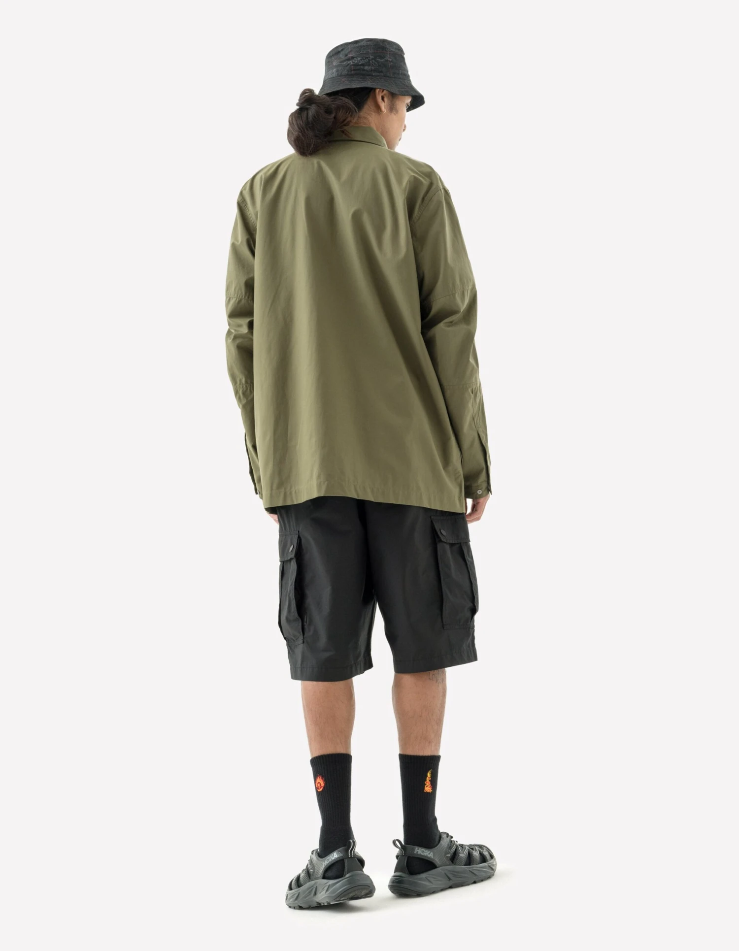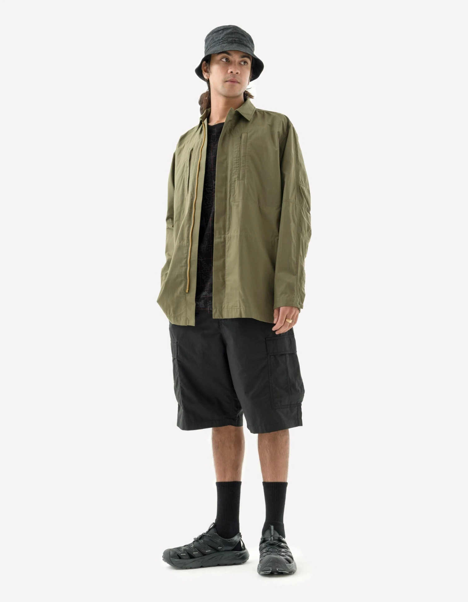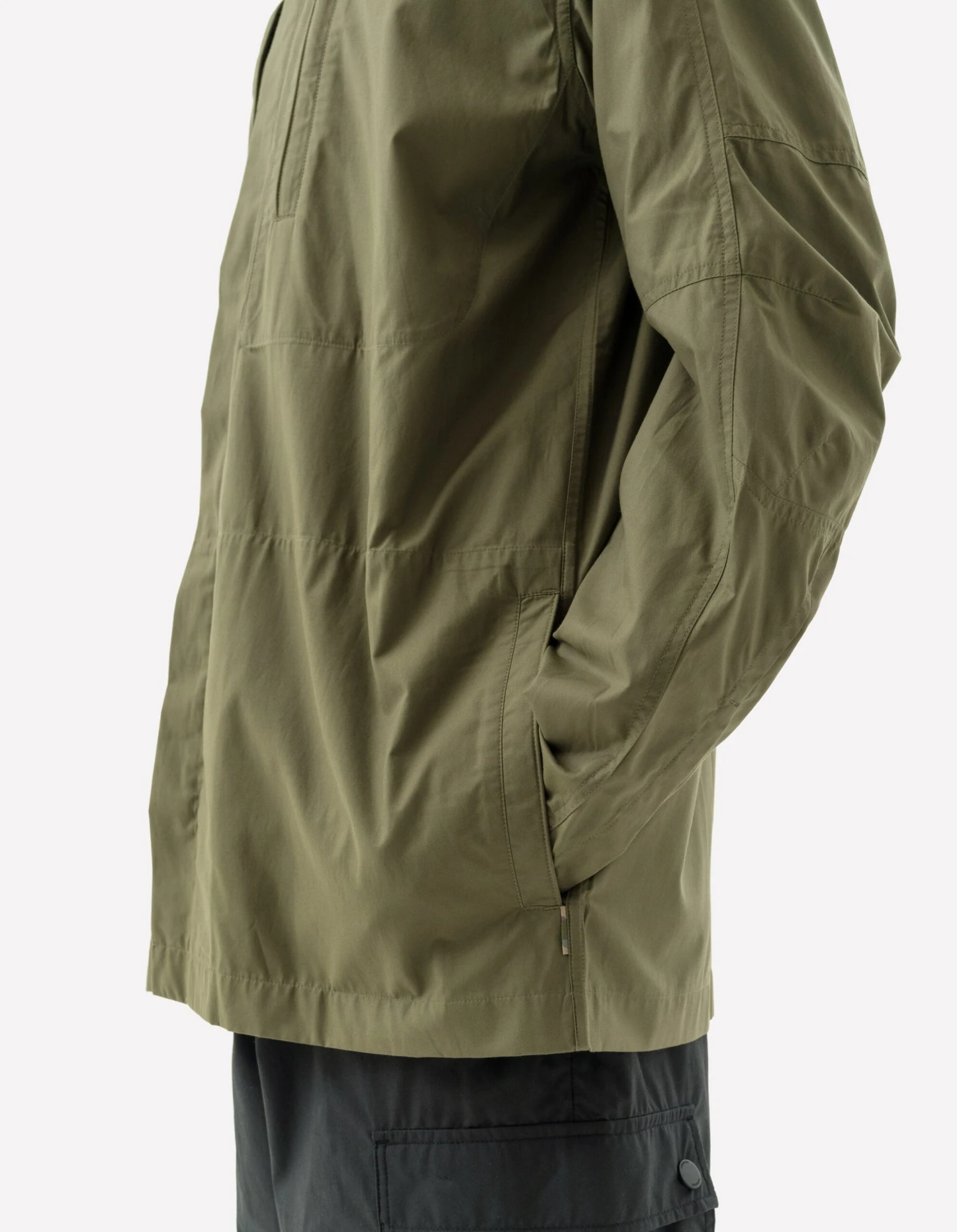 Relaxed fit trekking shirt of lightweight cotton-poly. Secure Napoleon style zip pockets and articulated sleeve pattern.