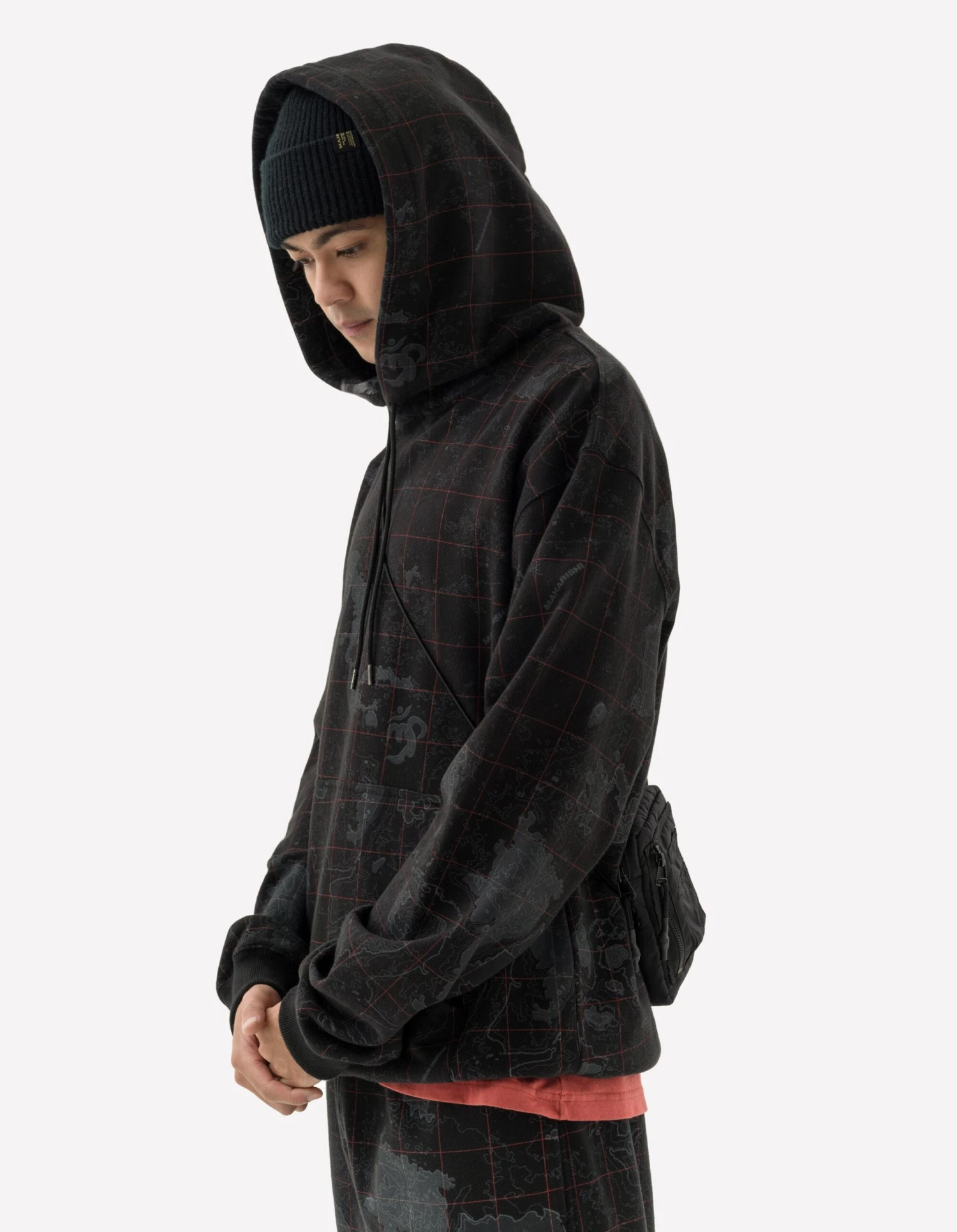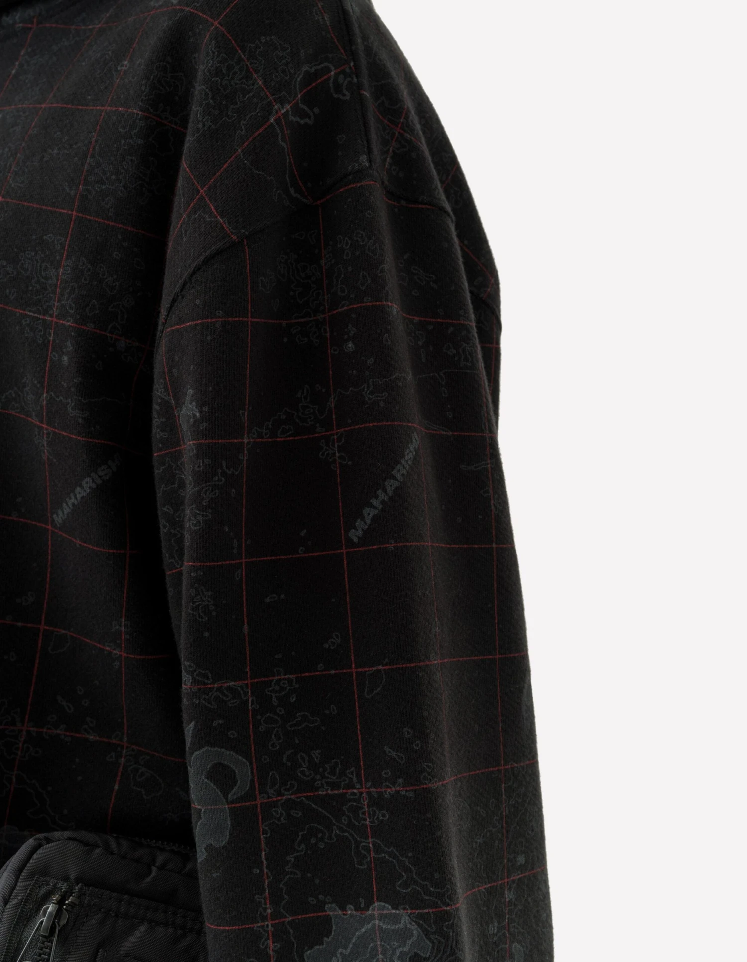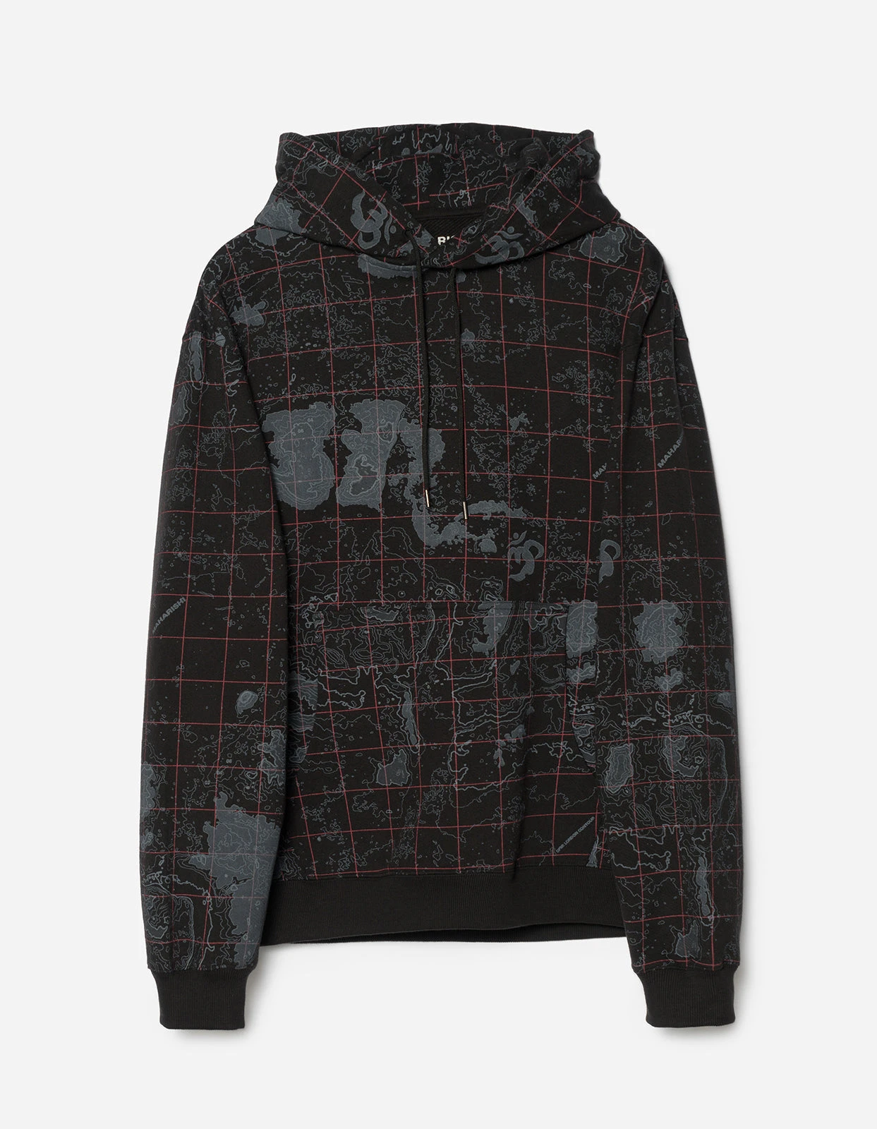 All over print camo hoody in the DPM: London Contour. Cut to a relaxed fit from heavyweight jersey. Maharishi explores topographic maps for it’s Great East/West Outdoors collection, with a topographic Ordnance Survey map of London, showing 2-3 Great Pulteney Street in the centre.