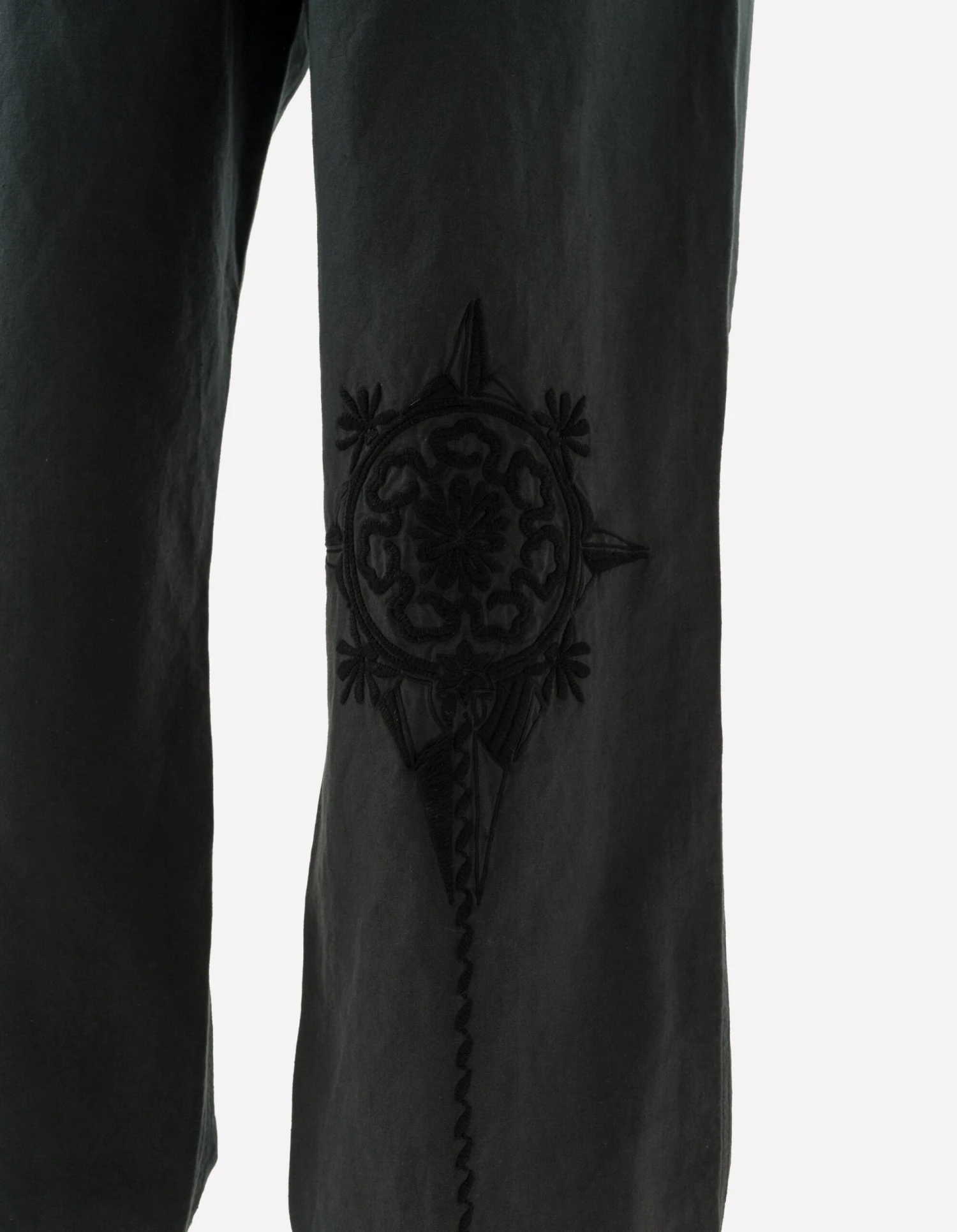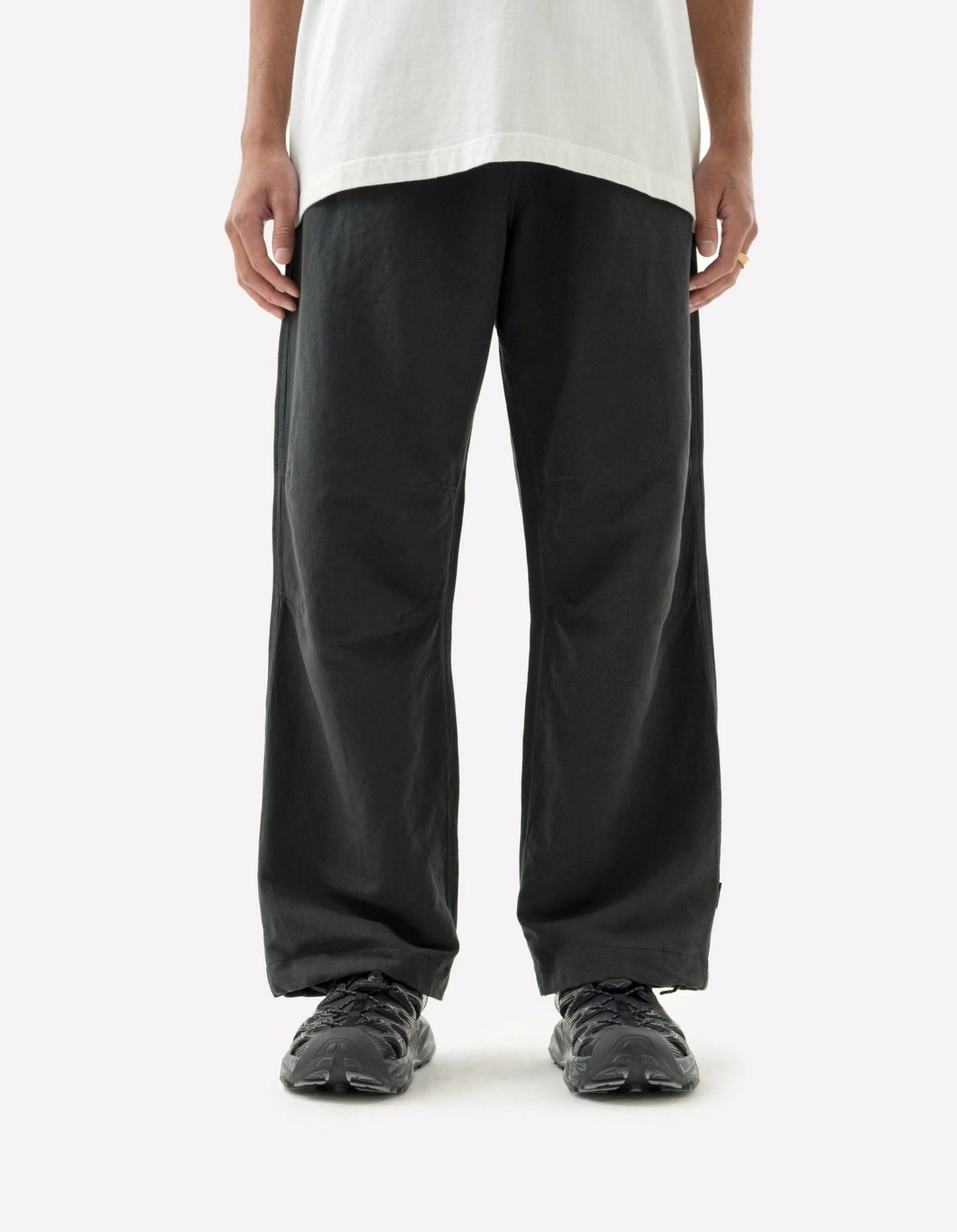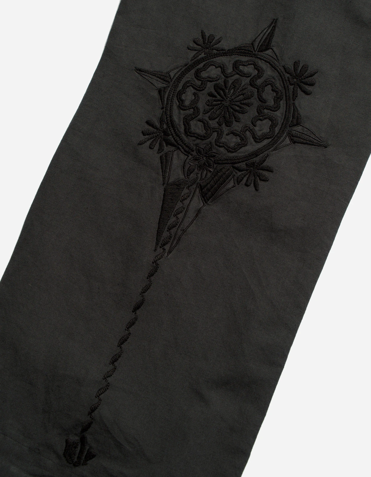 Track pants constructed from a lightweight hemp cotton. Cut to a loose fit throughout the leg to offer full mobility. High-rise with a drawcord waist for adjustment. Featuring a hand-machine-embroidered Thar compass on the lower back leg.