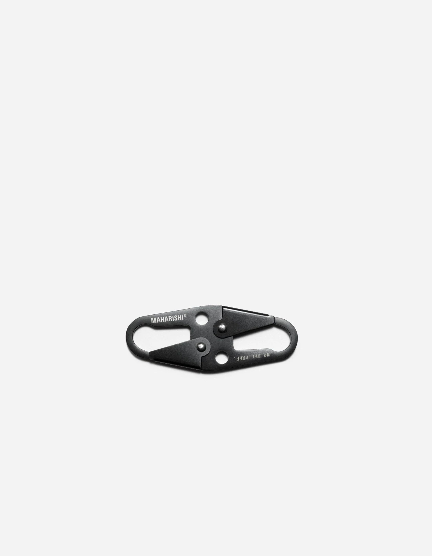 A two-way carabiner with spring loaded gates, suitable for securely hanging keys and other accessories. An enhanced dual design, based on the ‘HK’ clip used for U.S military weaponry, comes titanium coated and finished with Maharishi MILTYPE etched branding.