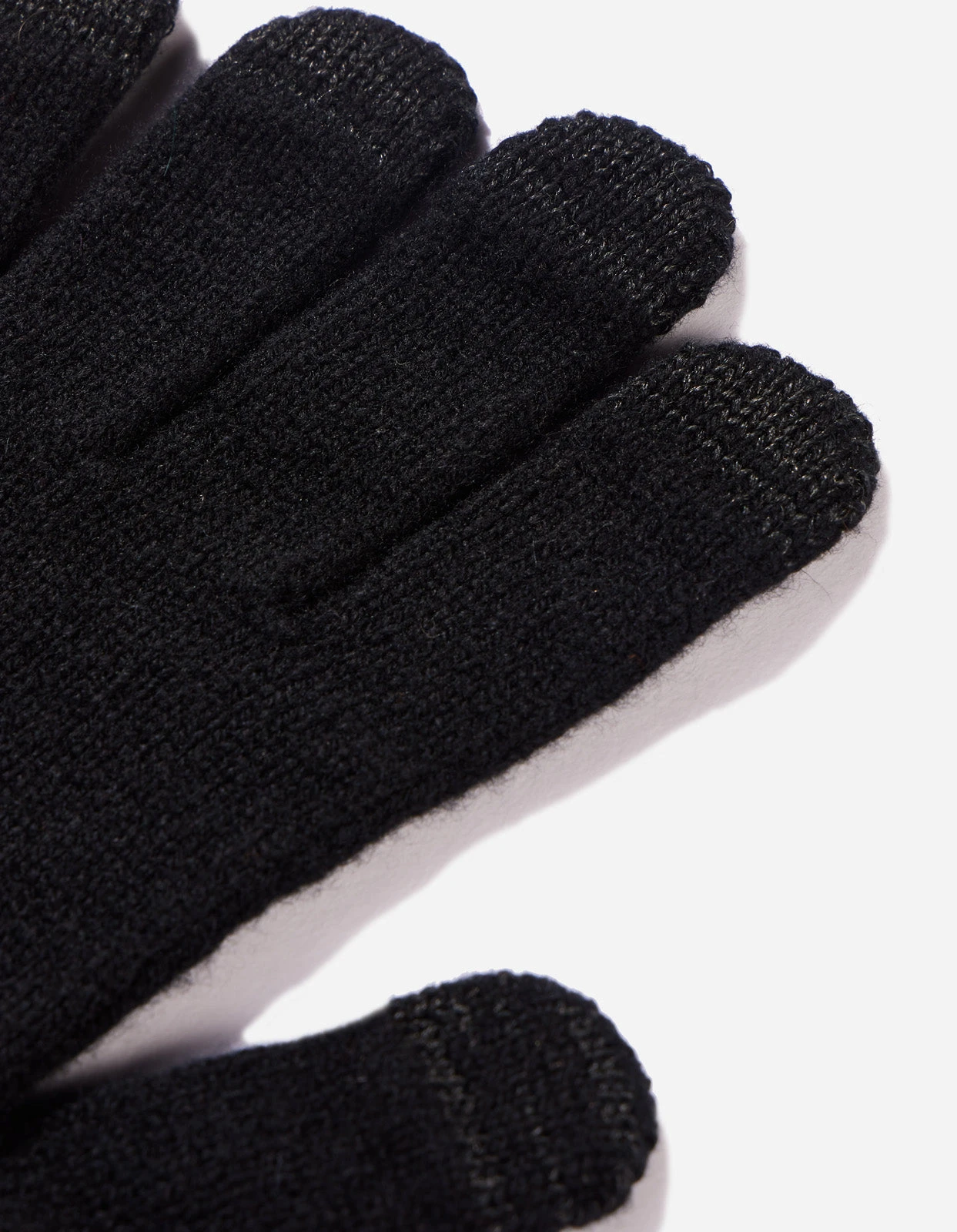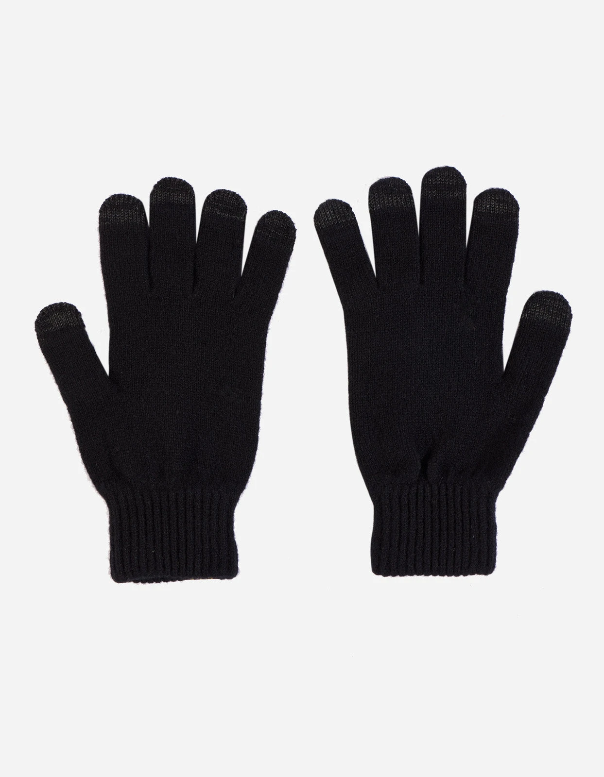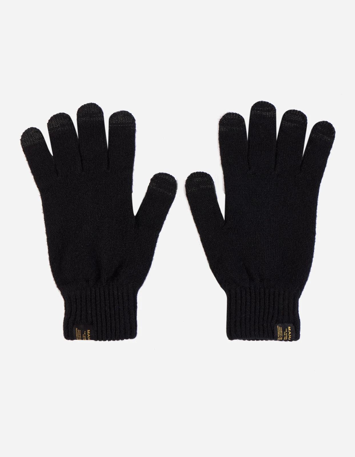 Knitted wool gloves made by Scottish heritage mill Robert Mackie. The gloves feature conductive finger tips allowing use of touch screens and Maharishi woven branding on both.